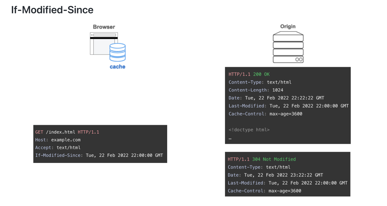 ETag헤더를 같이 보내준다. If-None-Match라는 헤더에 ETag헤더의 값을 담아 보낸다.If-None-Match값이 원본 리소스의 ETag값과 같은지 판단한다.둘을 같이 명시하면, Last-Modified & If-Modified-Since가 무시당한다. 설령 브라우저가 ETag & If-None-Match를 지원하지 않더라도 무조건 무시당한다!