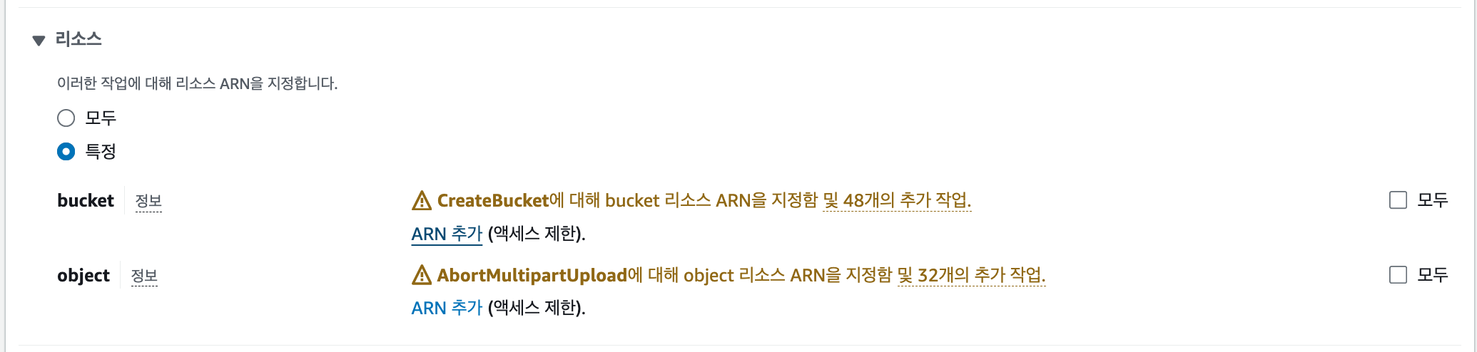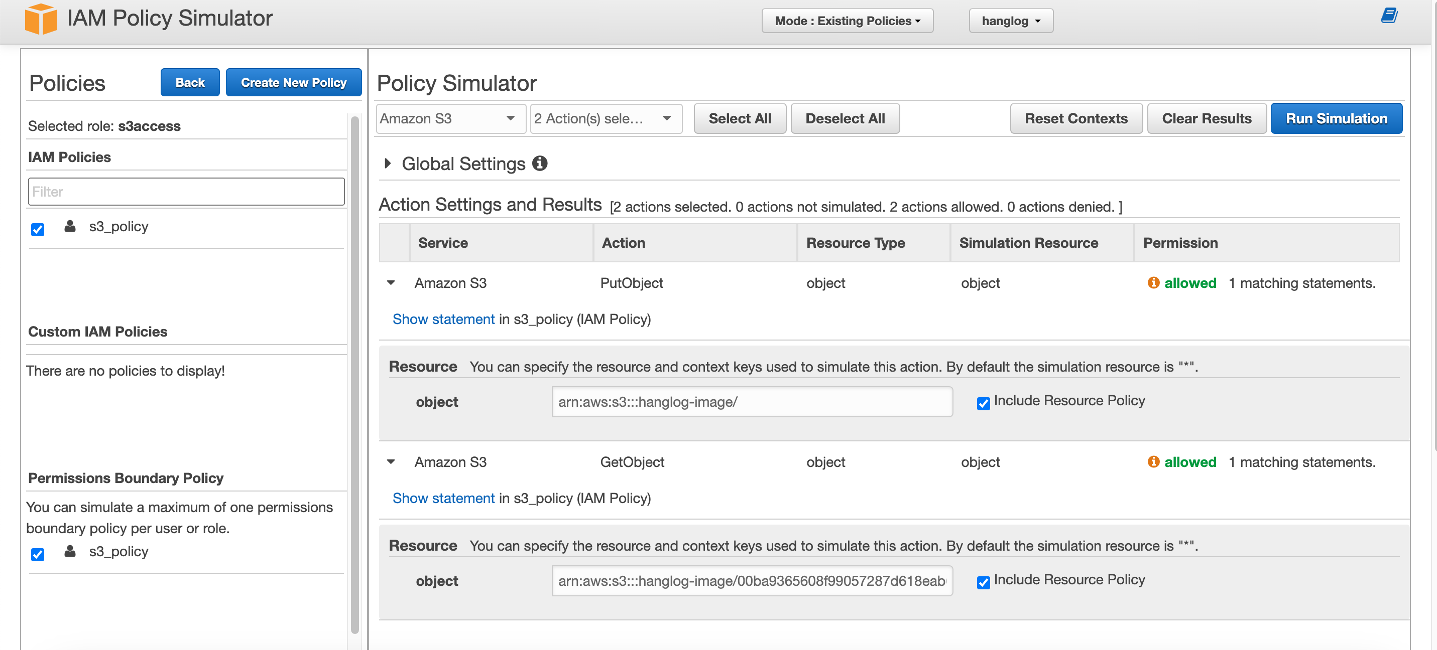 테스트하고싶은 정책을 선택한 후, 테스트하고 싶은 작업을 선택해 테스트용 리소스를 등록해주면 된다. (PutObject의 경우 버킷의 최상단 루트 arn을 등록, GetObject의 경우 테스트용 object를 미리 업로드하고 해당 object의 arn을 등록해주었다.)