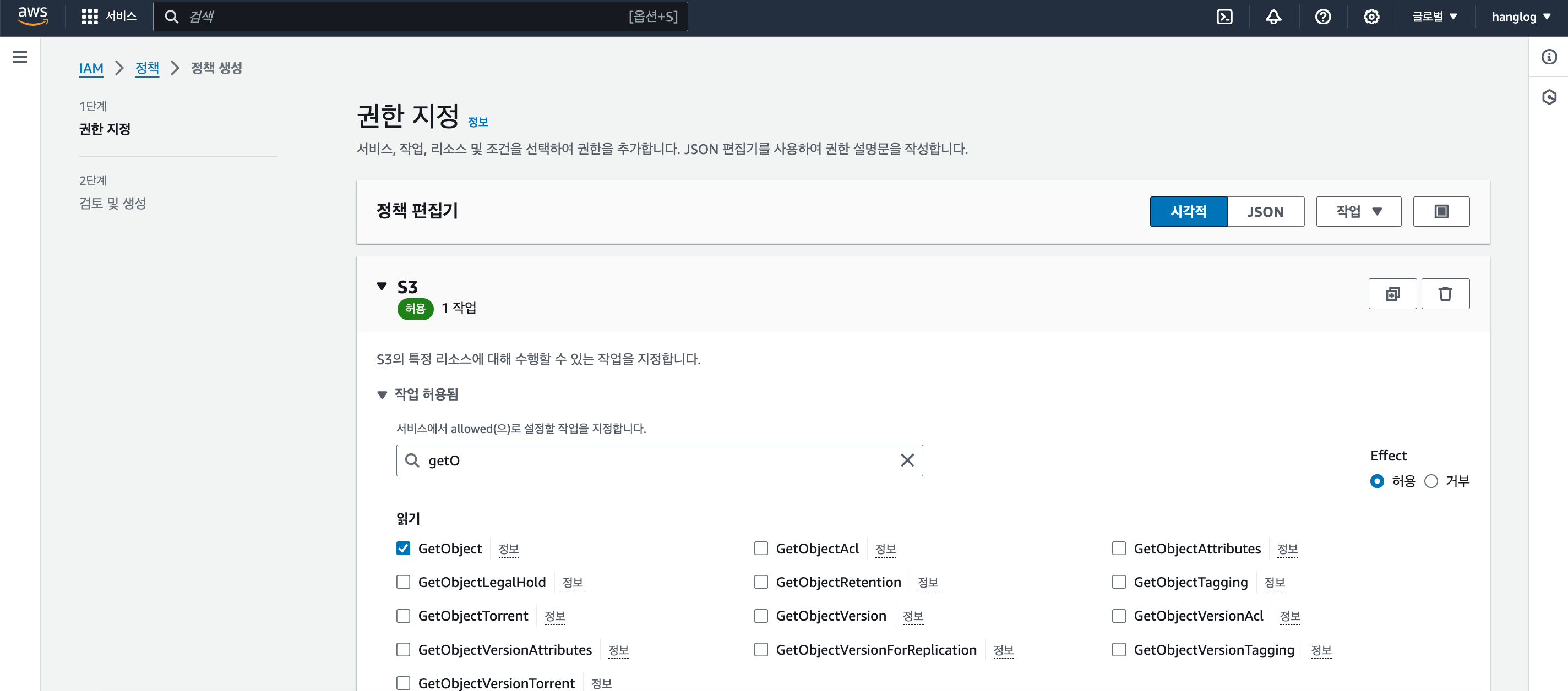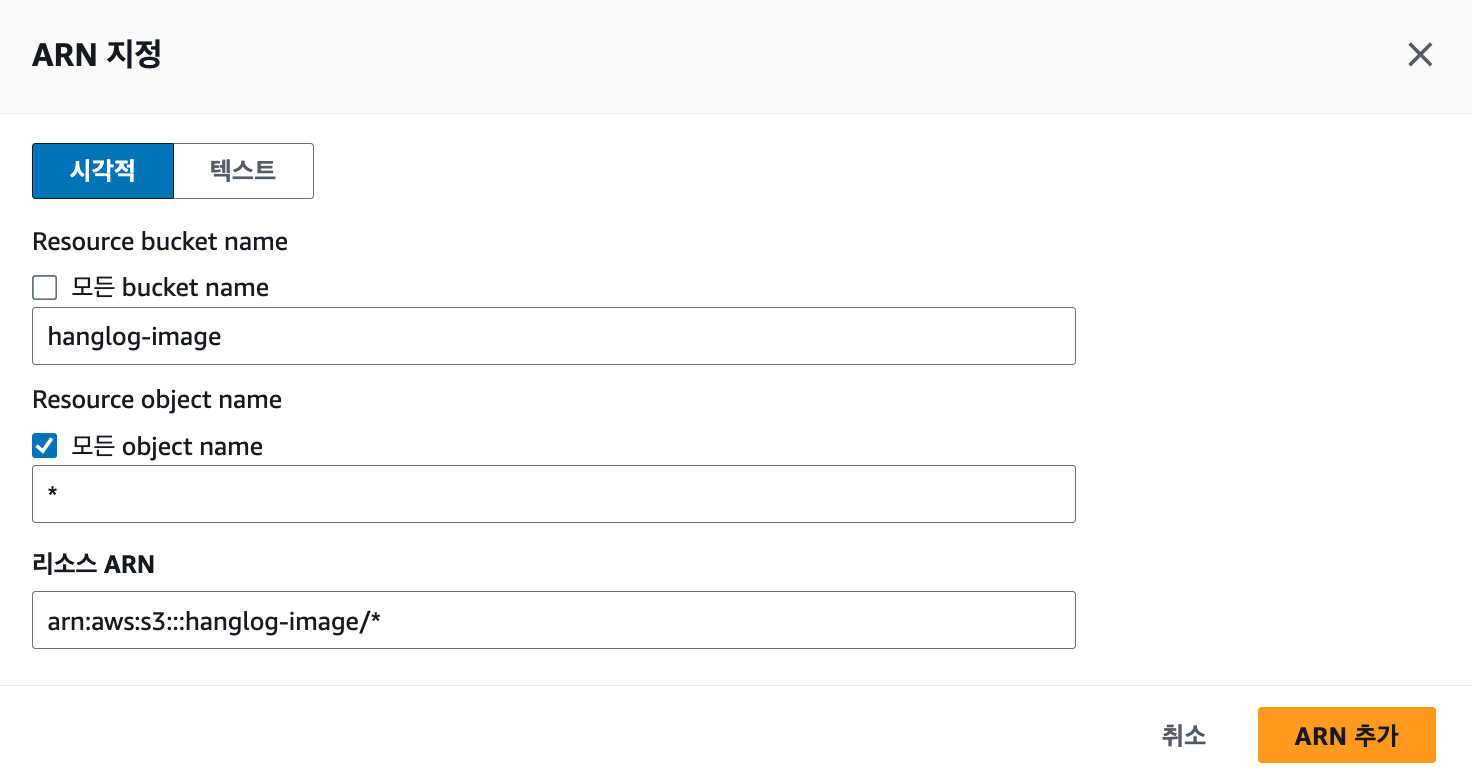 퍼블릭 엑세스를 차단한 버킷 하나를 생성했다. 버킷의 이름은 hanglog-image로 지정했다.