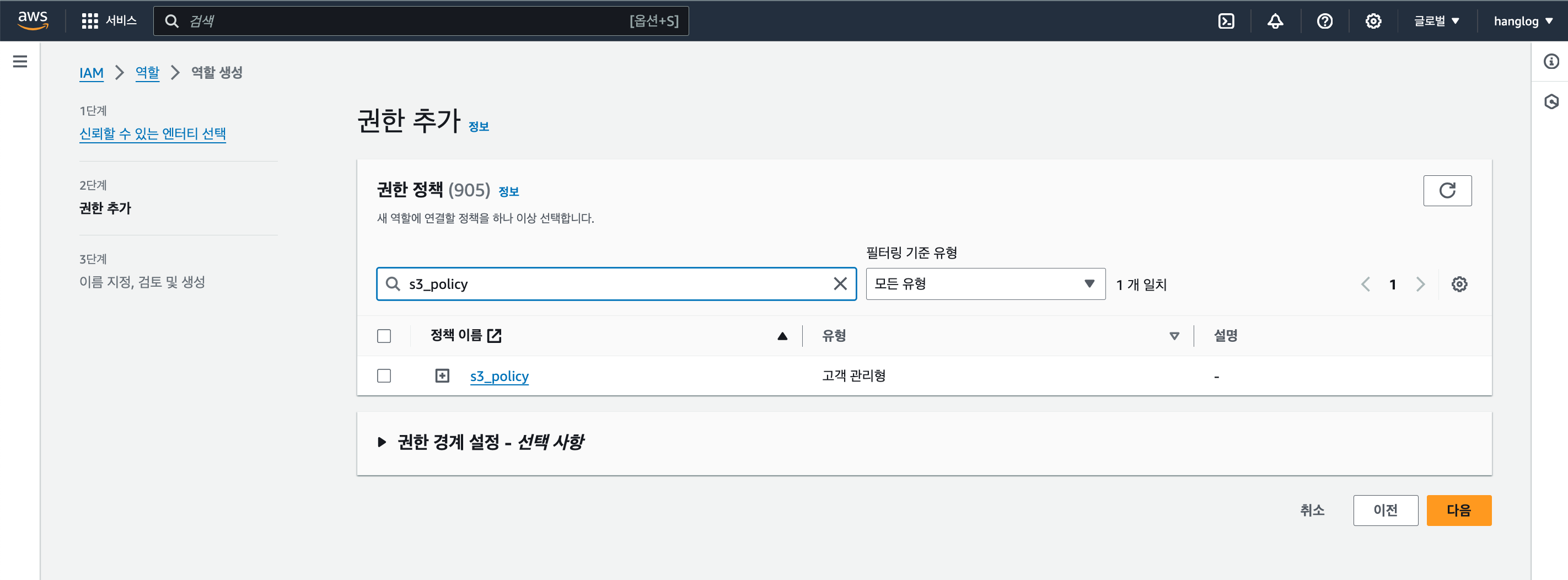 다음을 눌러 정책의 이름을 지정하고 생성한다. 정책의 이름은 s3_policy로 지정했다.