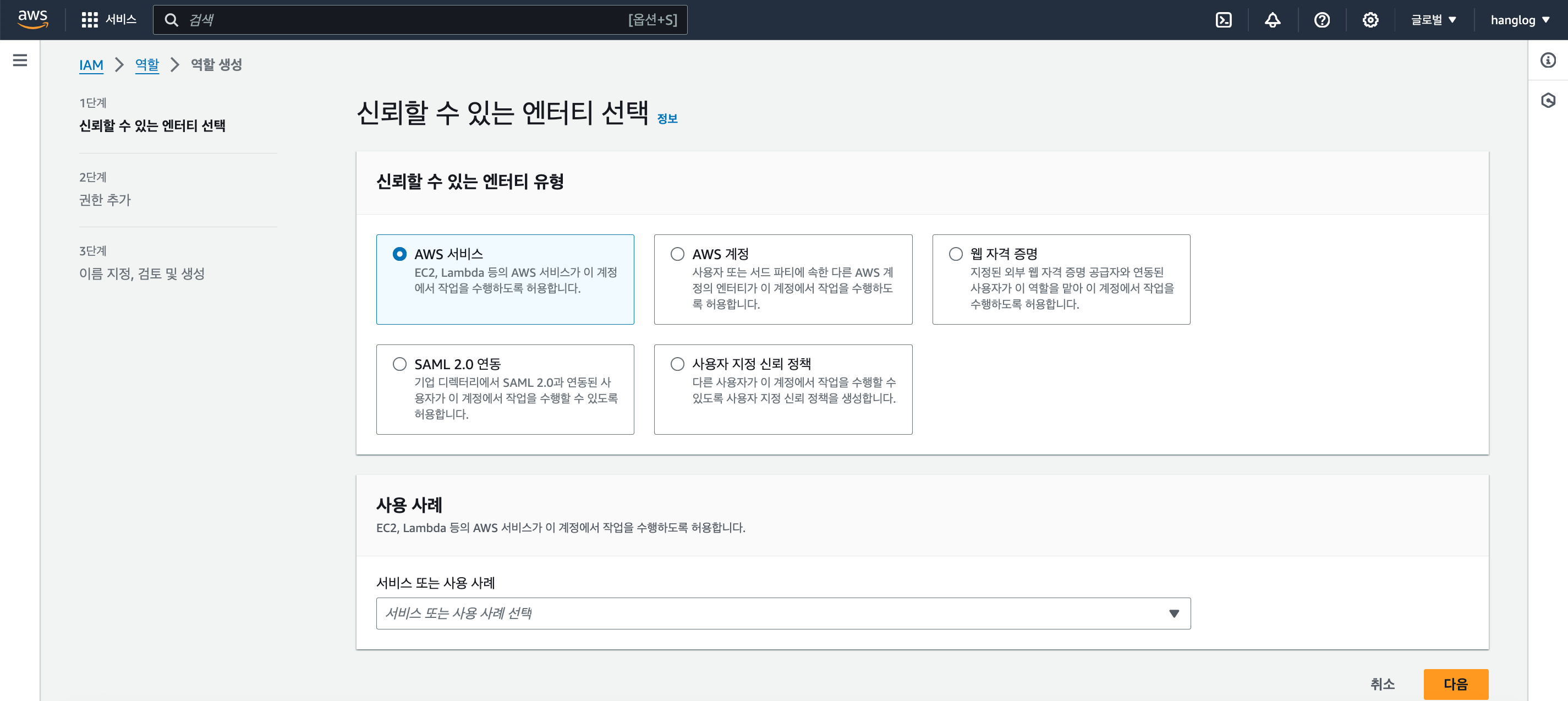 AWS 콘솔에서 IAM -> 역할 로 들어가 새 역할을 생성해준다.
