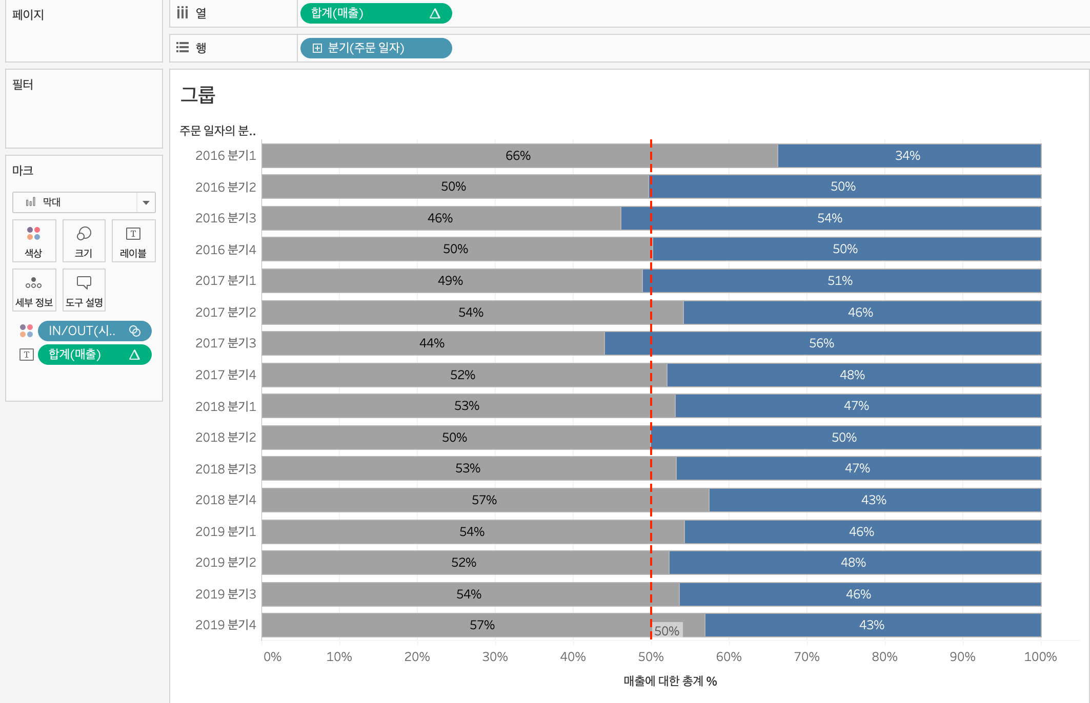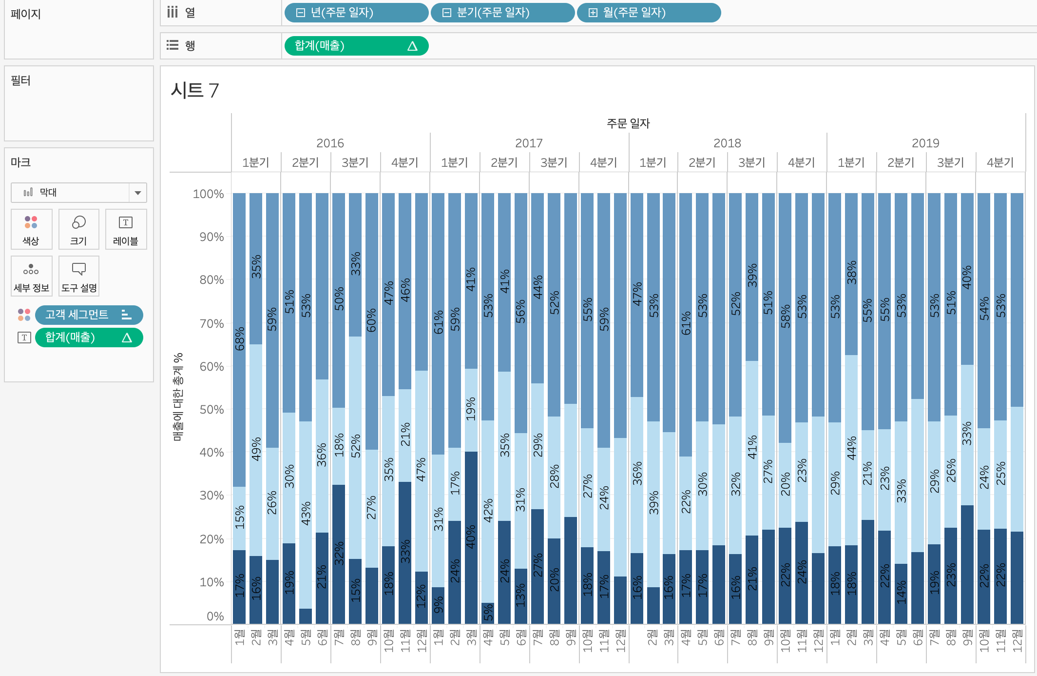 합계를 퀵계산으로 구성비율로 바꿔주고 레이블에 드래그해서 막대에 비율을 표시한다. 합계를 다시 우클릭 - 다음을 사용해서 계산 - 테이블(아래로)