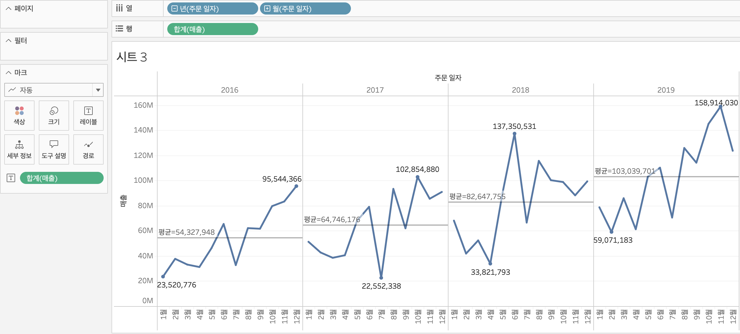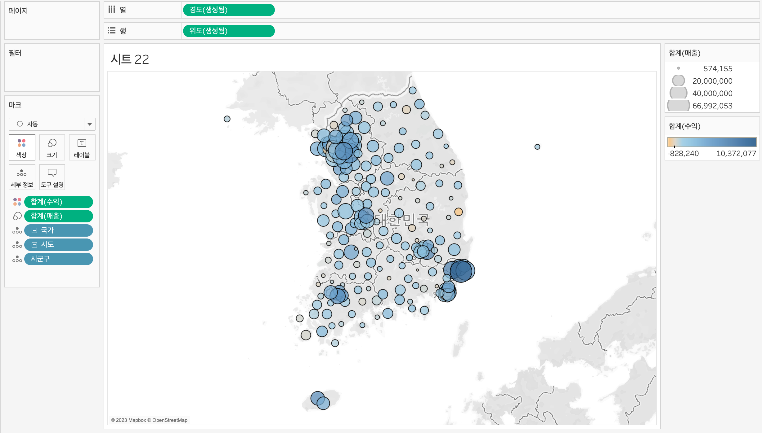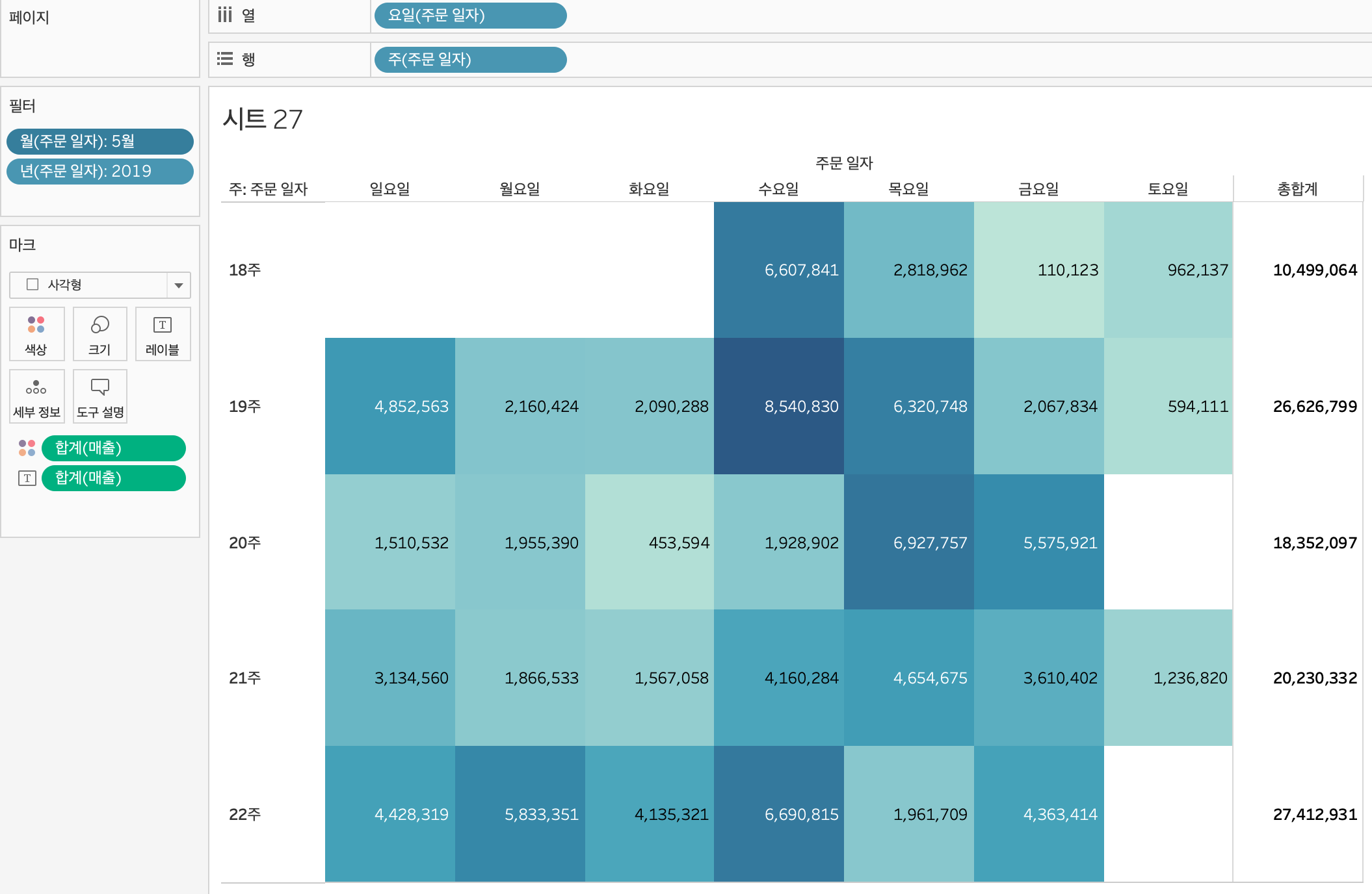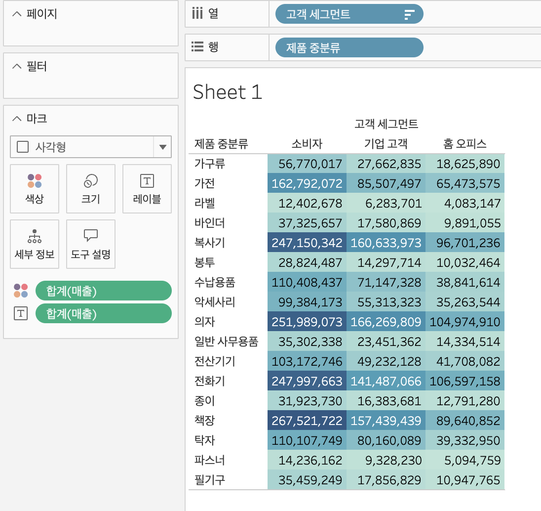 커맨드 키를 누르면서 매출을 색상에 드래그하면 시각화하기 좋게 표현할 수 있다.