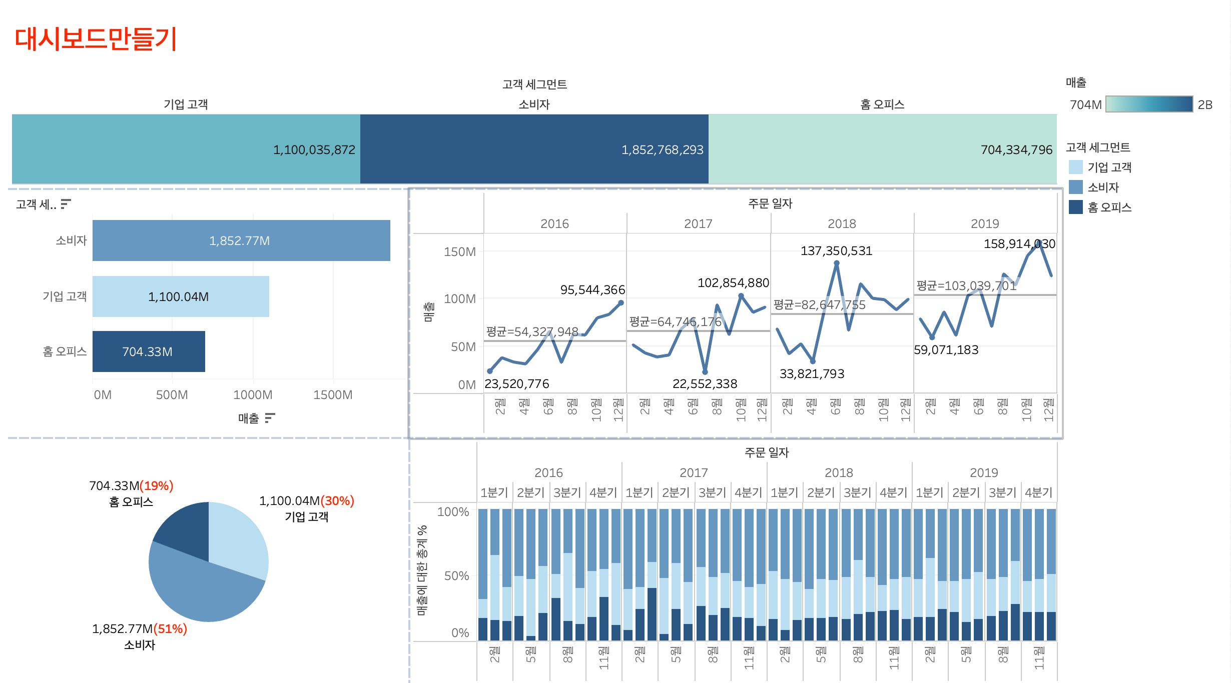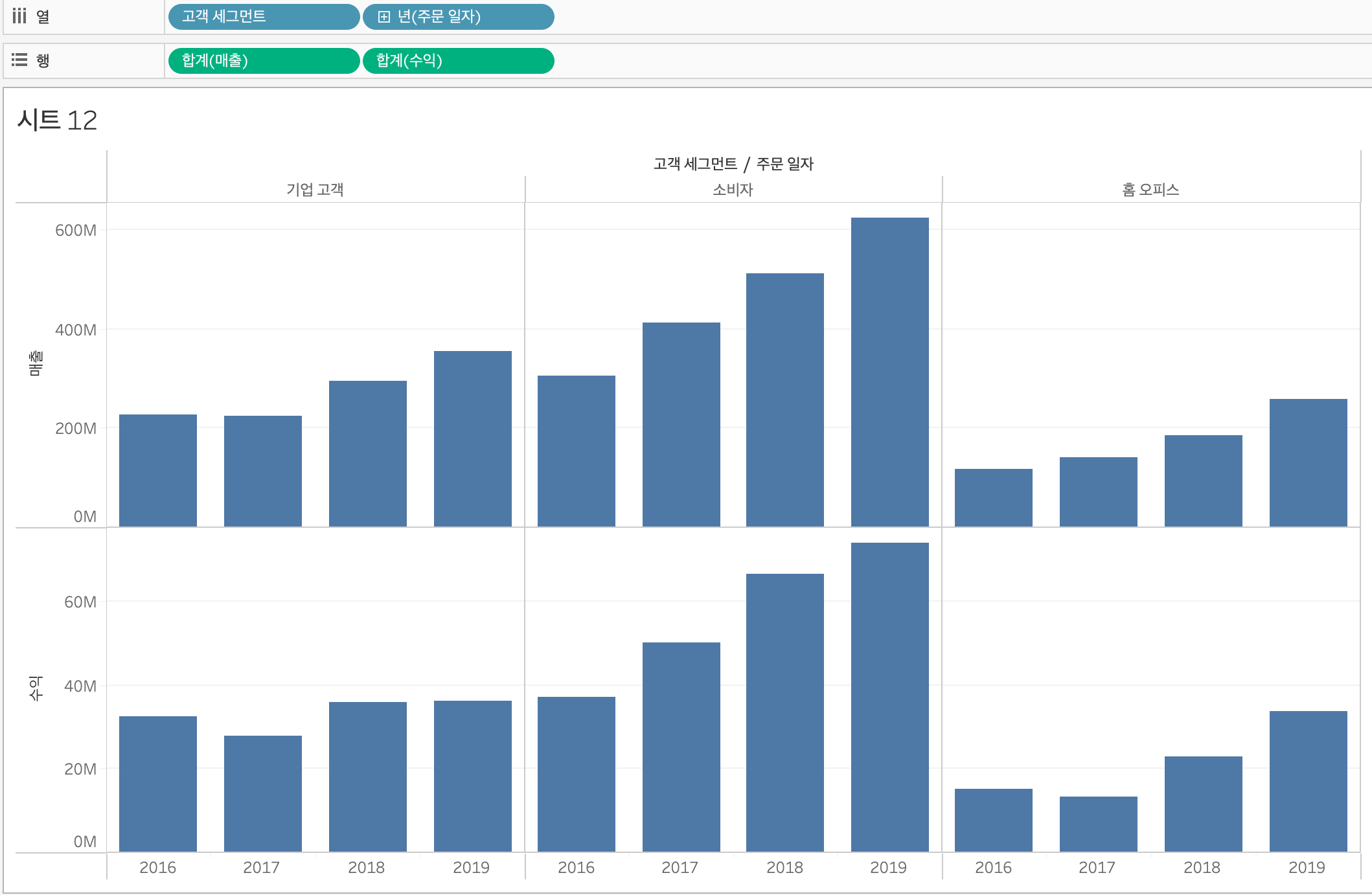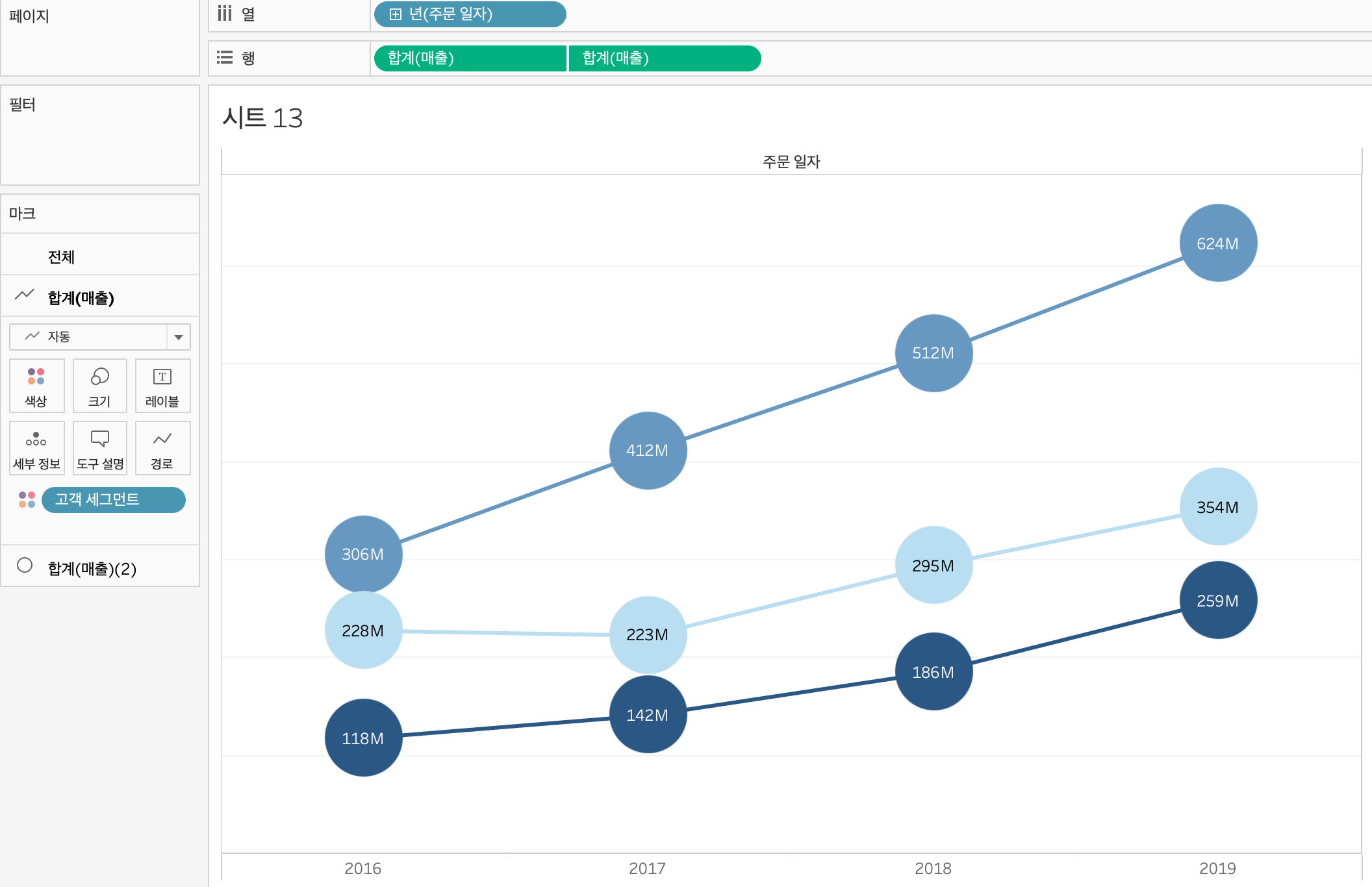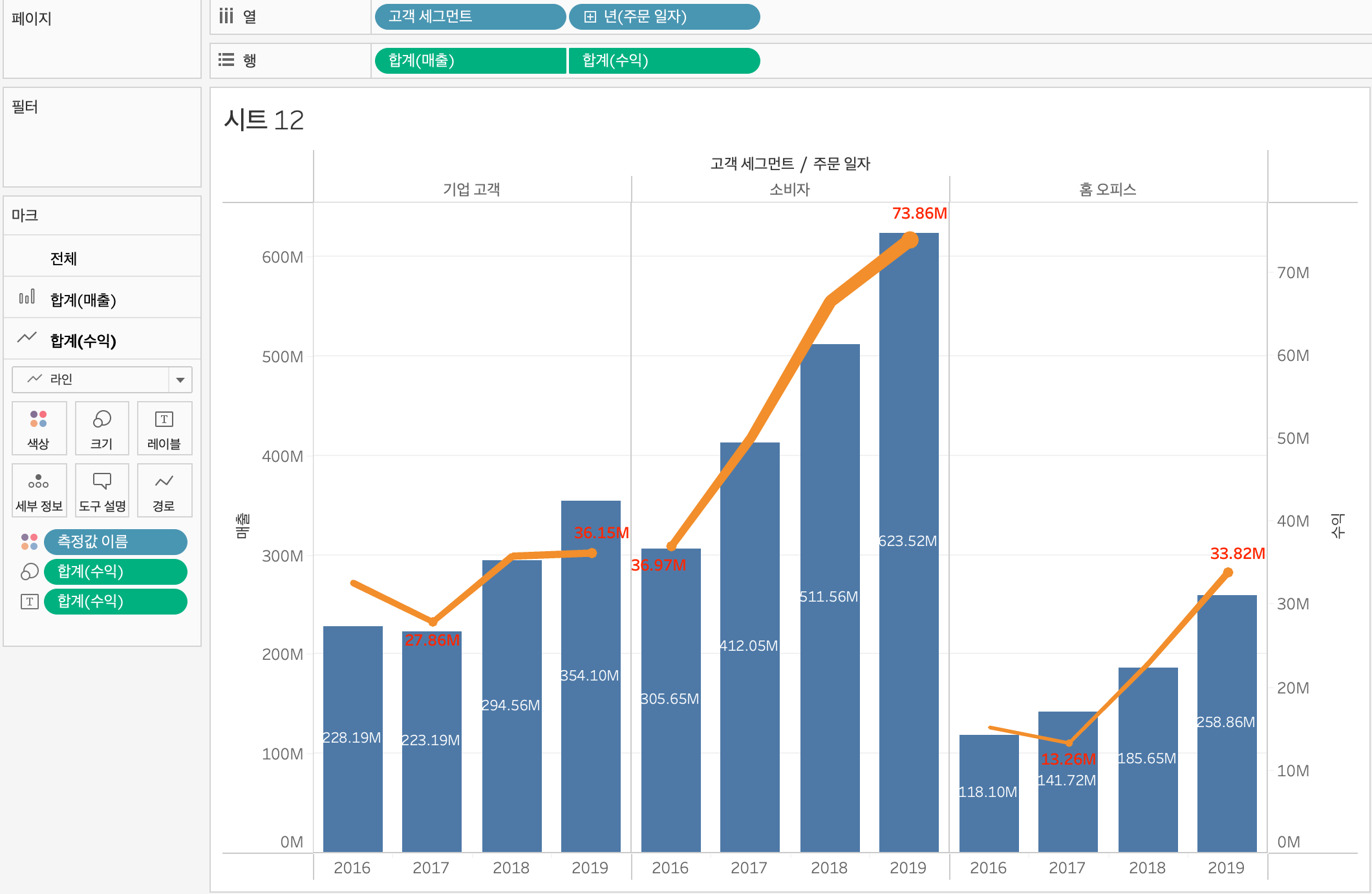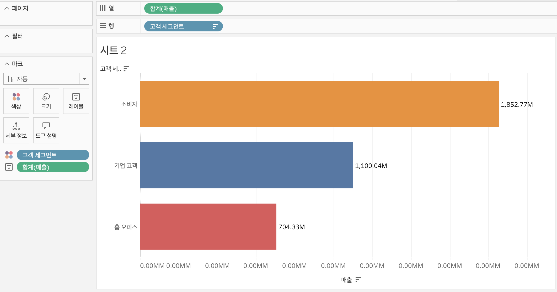매출을 레이블에 드래그해서 넣으면 막대 그래프에 합계 매출을 나타낼 수 있고, 고객 세그먼트를 색상에 드래그하면 각 막대별로 색상이 생긴다.