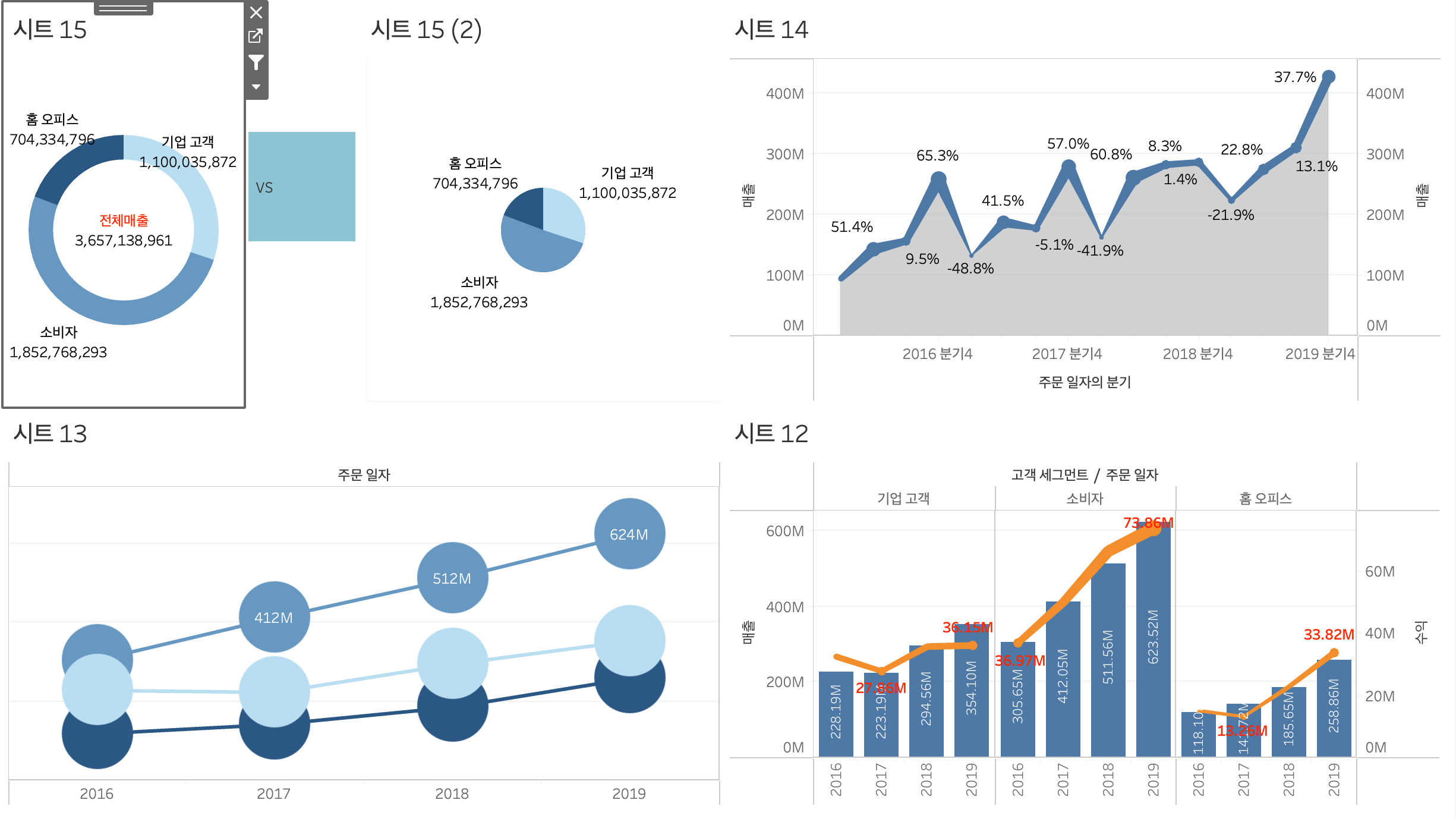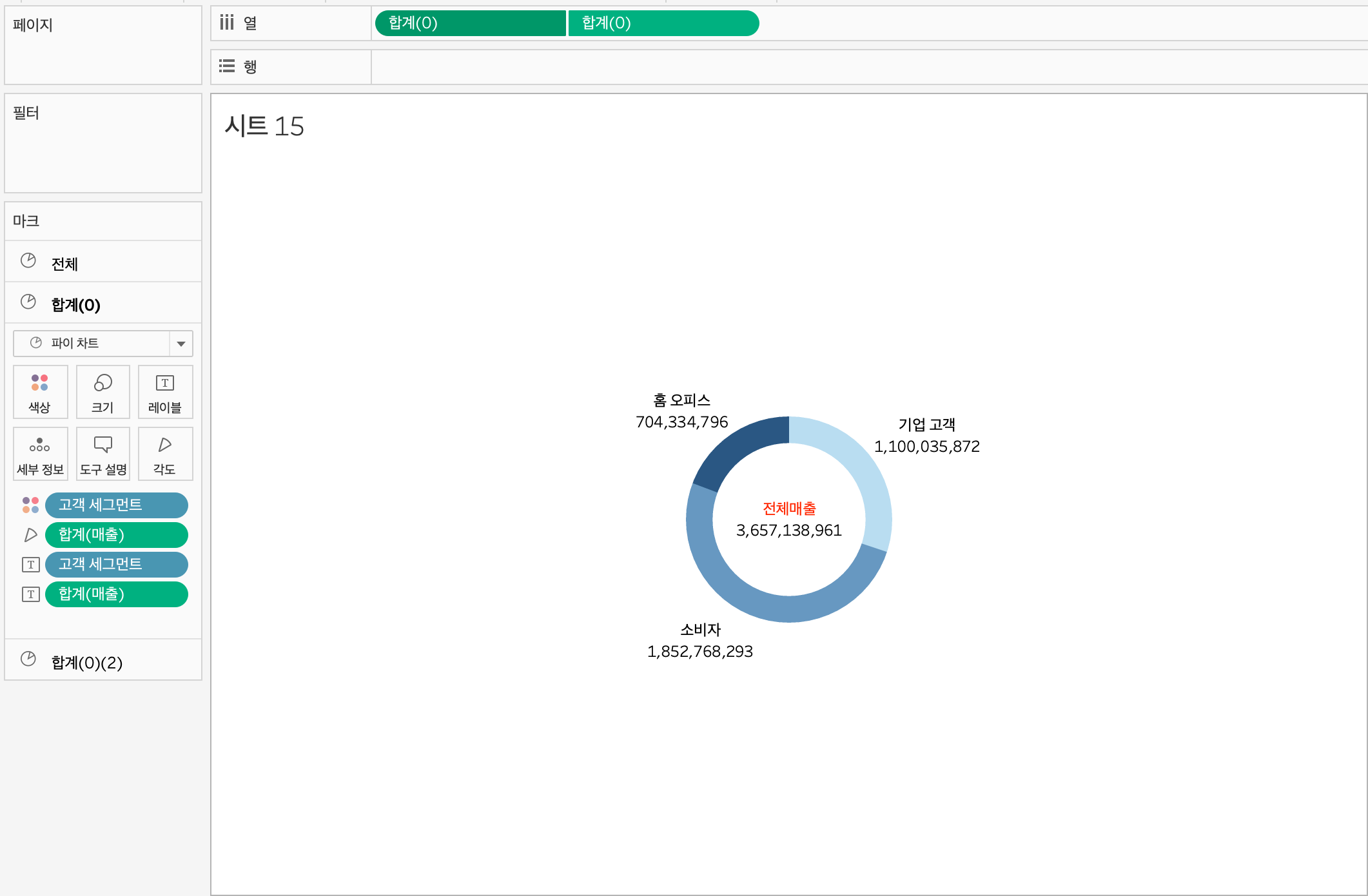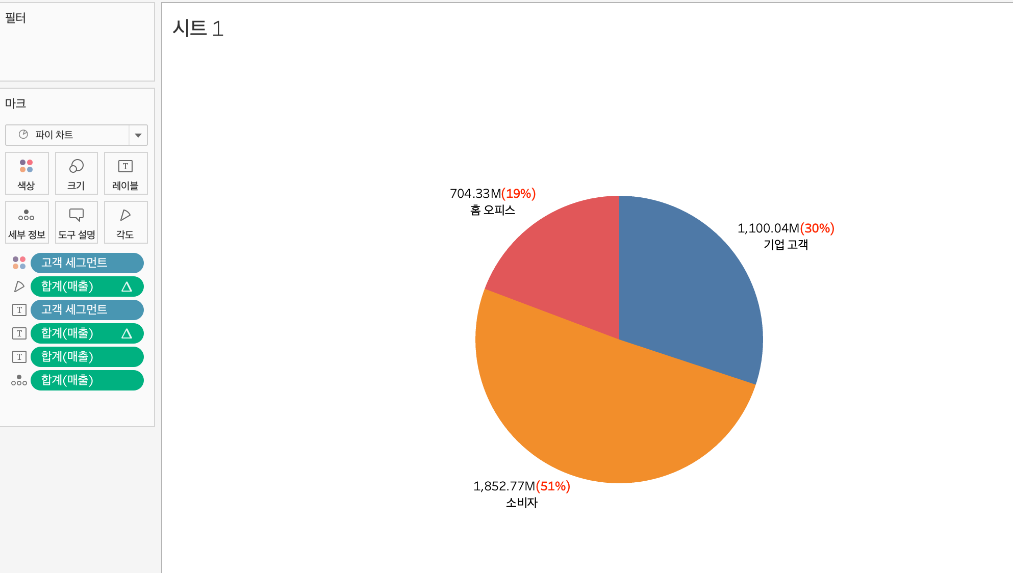 고객 세그먼트와 매출을 마크에 드래그한 뒤 파이차트로 변경