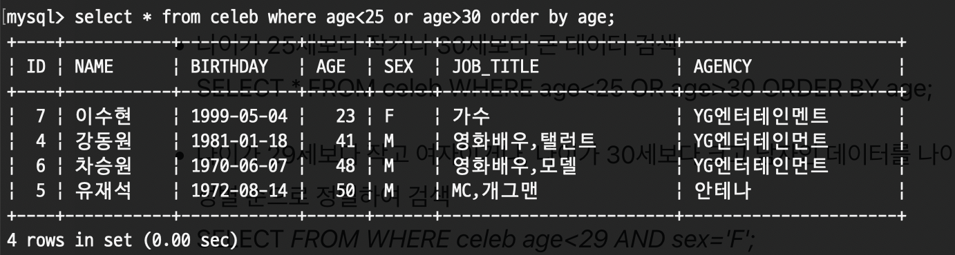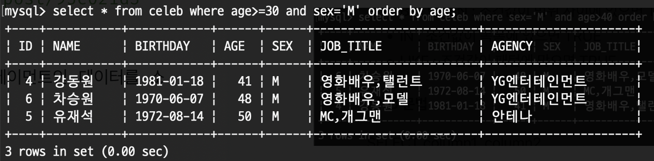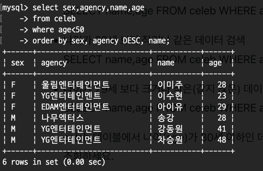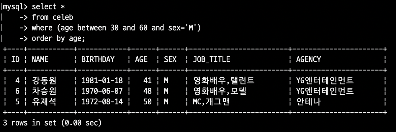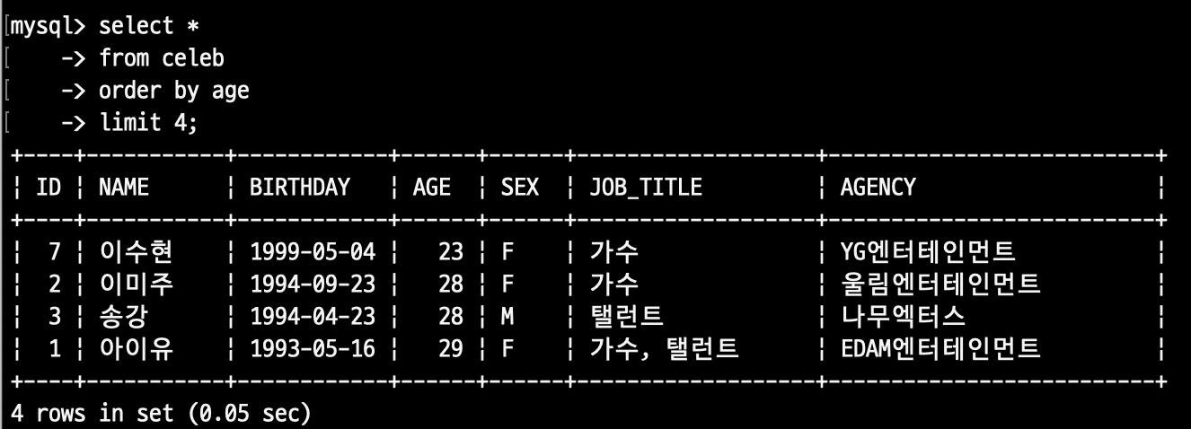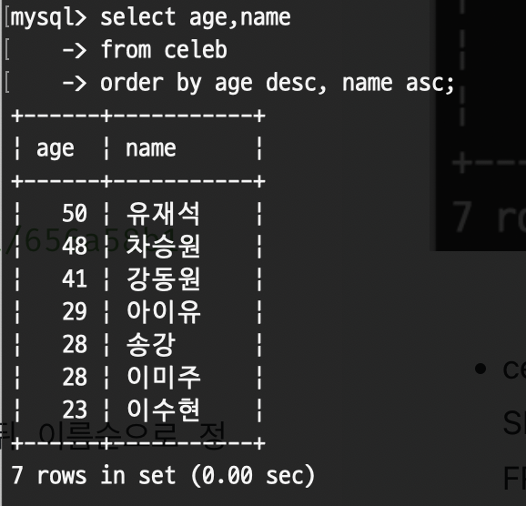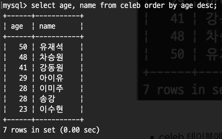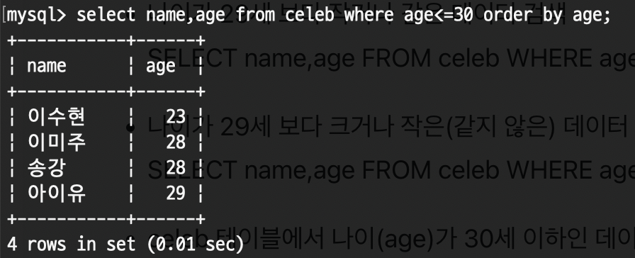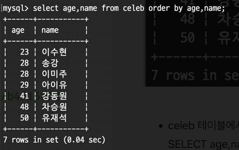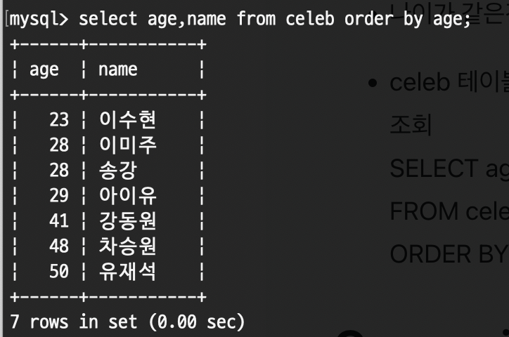 celeb 테이블에서 이름과 나이를 나이순으로 조회