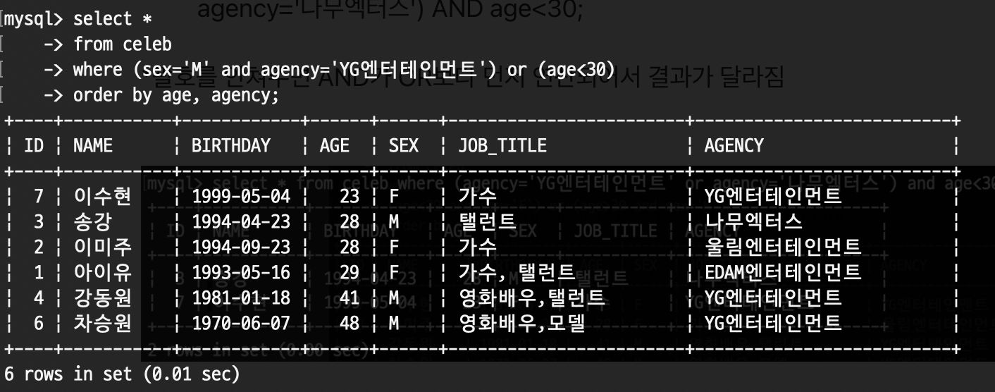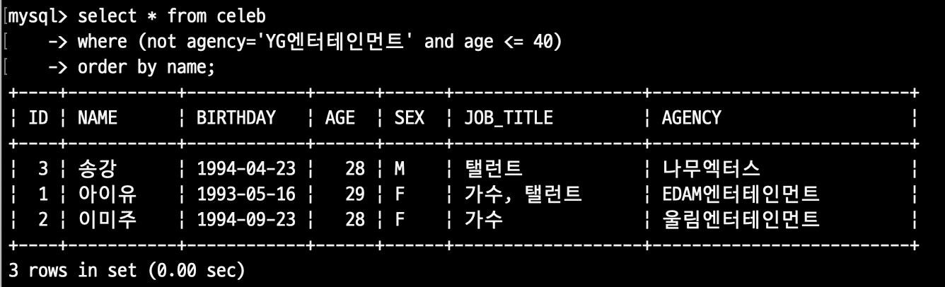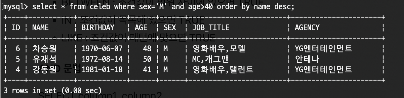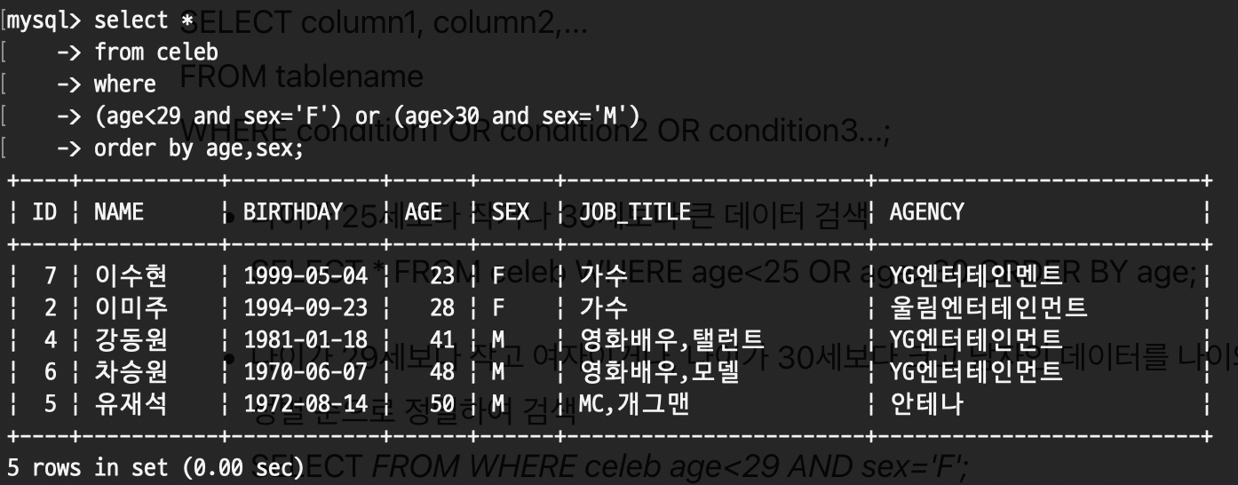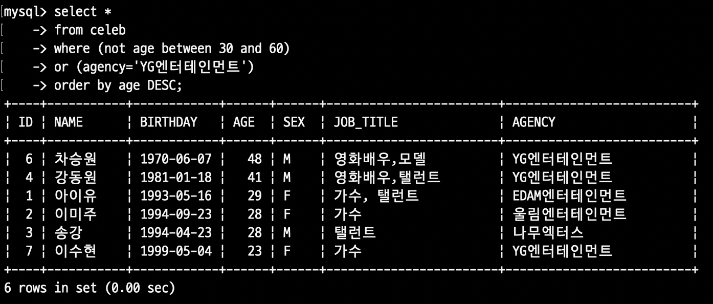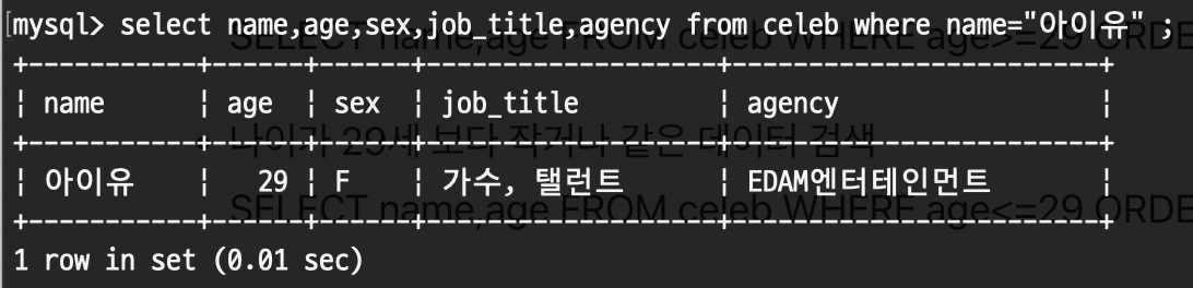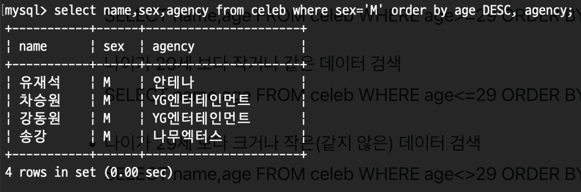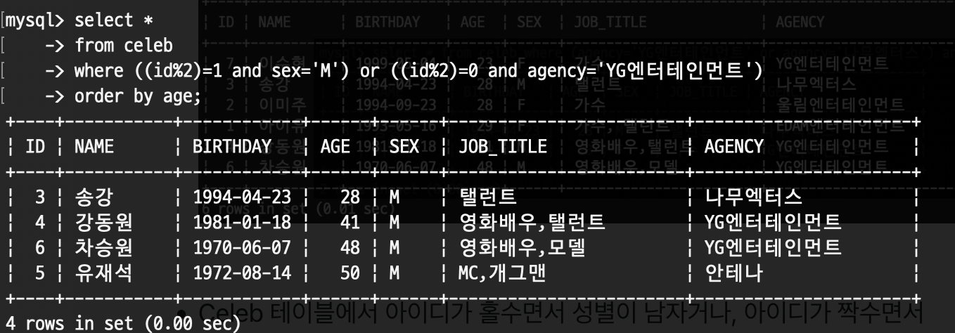 celeb 테이블에서 이름과 나이를 나이순으로 조회