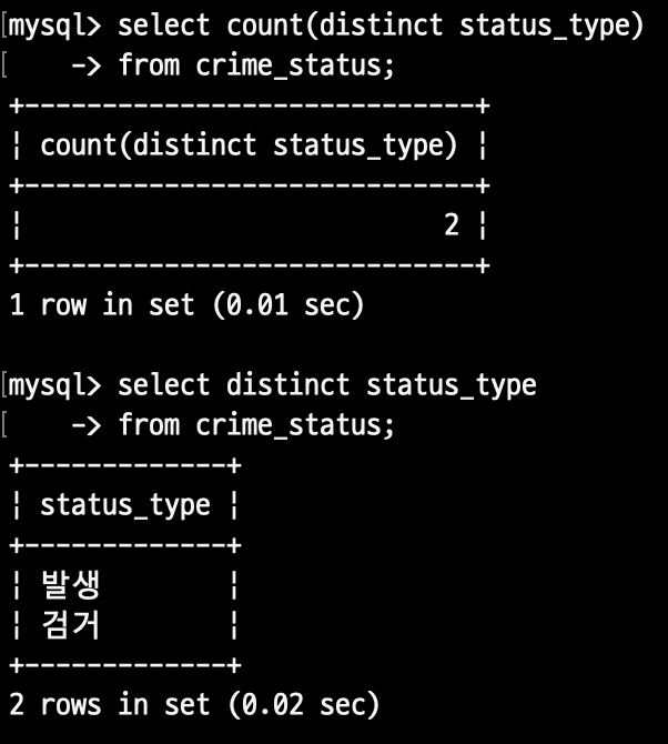 crime_status에서 status_type은 총 몇개이고, 각각 타입은 무엇인지 확인하세요