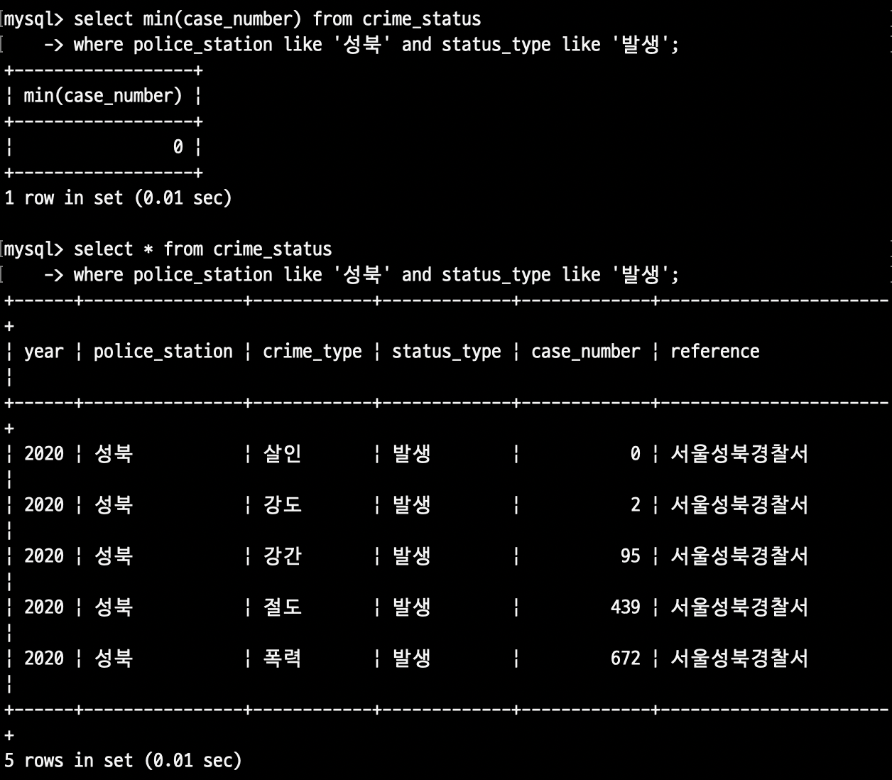 성북경찰서에서 가장 낮은 범죄 발생 건수를 검색하고 확인