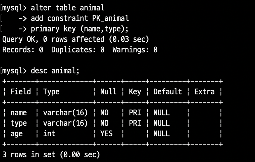 존재하는 테이블에 여러개의 칼럼을 기본키로 지정하는 경우