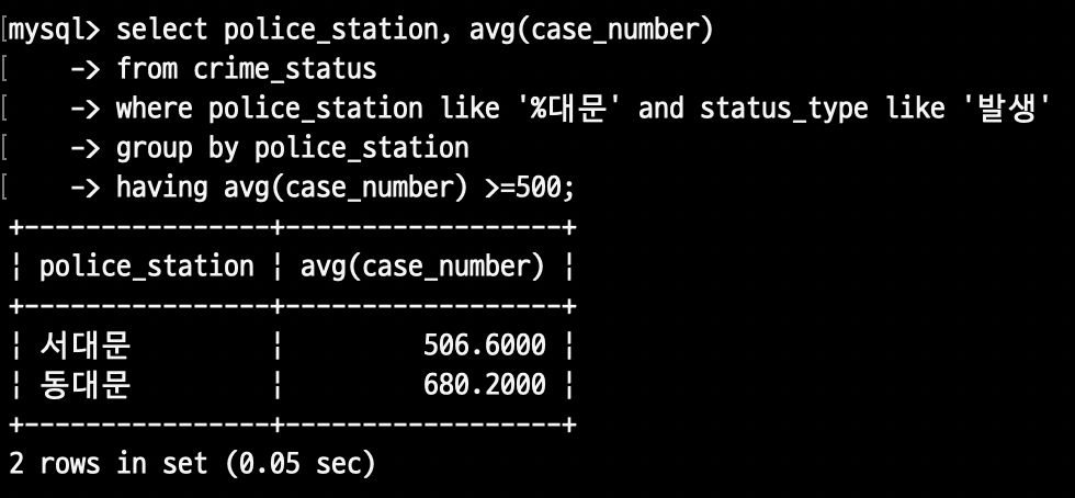 '대문'으로 끝나는 이름의 경찰서 별 범죄발생 건수의 평균이 500건 이상인 경우를 검색