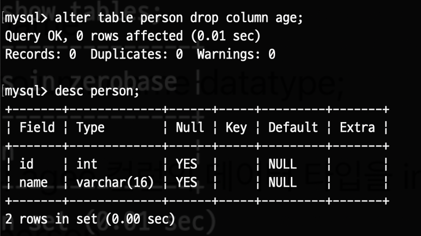 여러개의 칼럼이 기본키로 설정된 경우(삭제하는 방법은 동일)