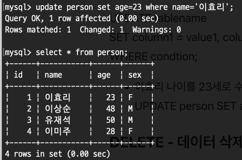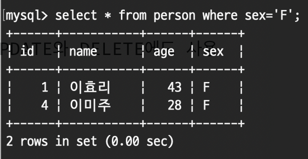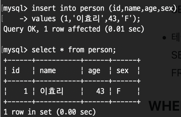 ID값이 1인 이효리, 43세, 여자(F) 데이터 추가