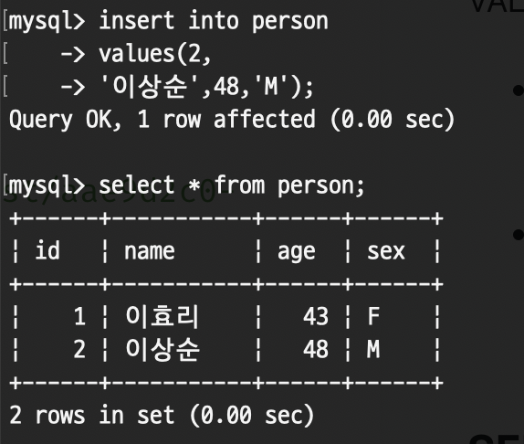 모든 컬럼값을 추가하는 경우에는 다음과 같이 컬럼 이름을 지정하지 않아도 되지만, 입력하는 값의 순서가 테이블의 컬럼 순서와 일치핟록 주의