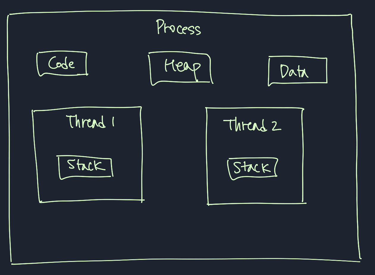 일을 수행할 때 일의 흐름을 기억하는 고유 스택이 지정되어 있지만 공통 데이터 리소스(code, heap, data)는 프로세스에 있기 때문에 이러한 리소스에 동시다발적 접근과 업데이트를 해야하므로 서로 공유하며 사용한다.