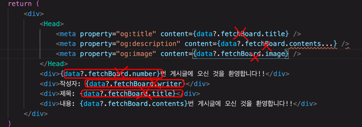 동적 페이지에 대해서는 다이나믹 오픈그래프를 만들어주어야하는데 위 방법으로는 어렵고 불가능하다.