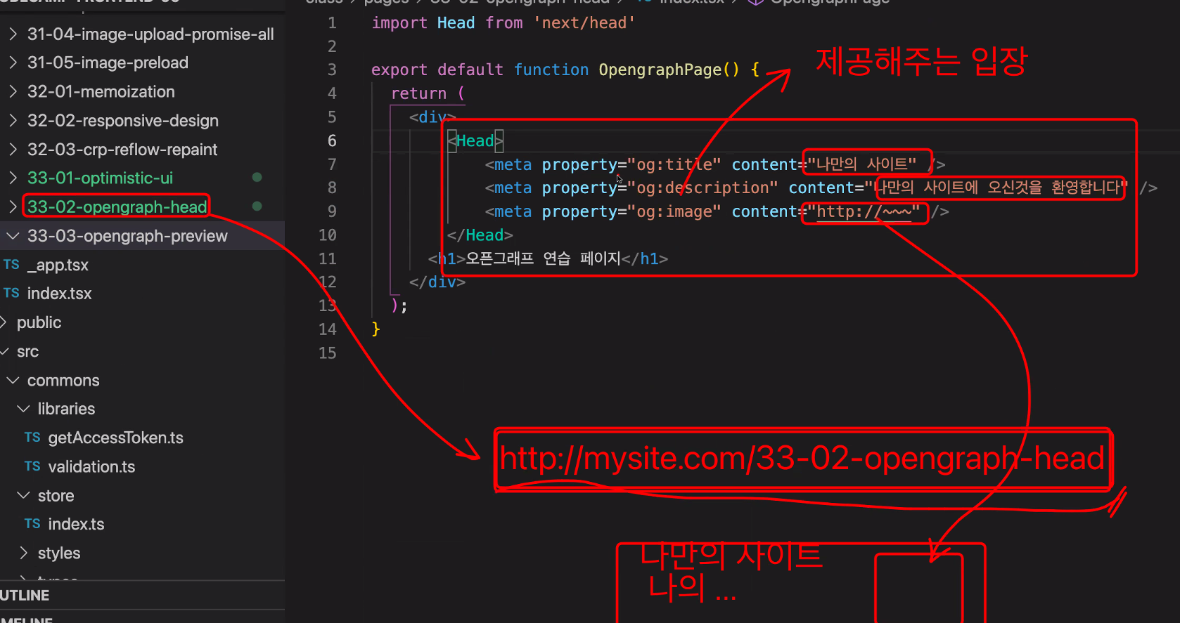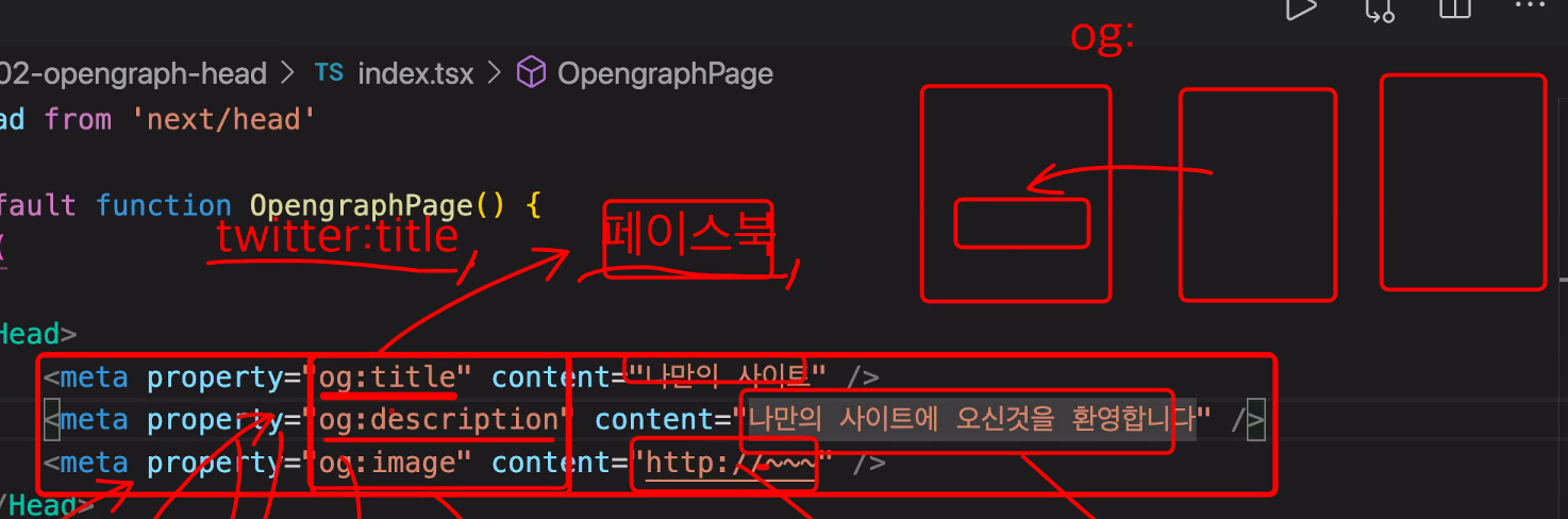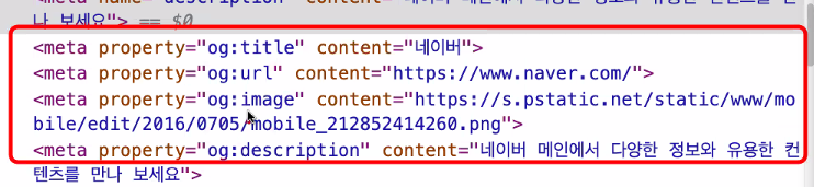 og라는 것은 다른 사람들의 페이지를 보여주게끔 하기 위해서 open graphic(og)으로 통일을 해서 스크래핑할 수 있게끔 하는 것. 페이스북에서 시작. twitter도 있다.