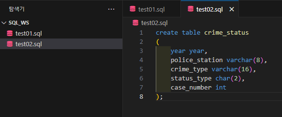 C:\sql_ws>mysql -u root -p zerobase Enter password: mysql> desc crime_status; +----------------+-------------+------+-----+---------+-------+ | Field | Type | Null | Key | Default | Extra | +----------------+-------------+------+-----+---------+-------+ | year | year | YES | | NULL | | | police_station | varchar(8) | YES | | NULL | | | crime_type | varchar(16) | YES | | NULL | | | status_type | char(2) | YES | | NULL | | | case_number | int | YES | | NULL | | +----------------+-------------+------+-----+---------+-------+