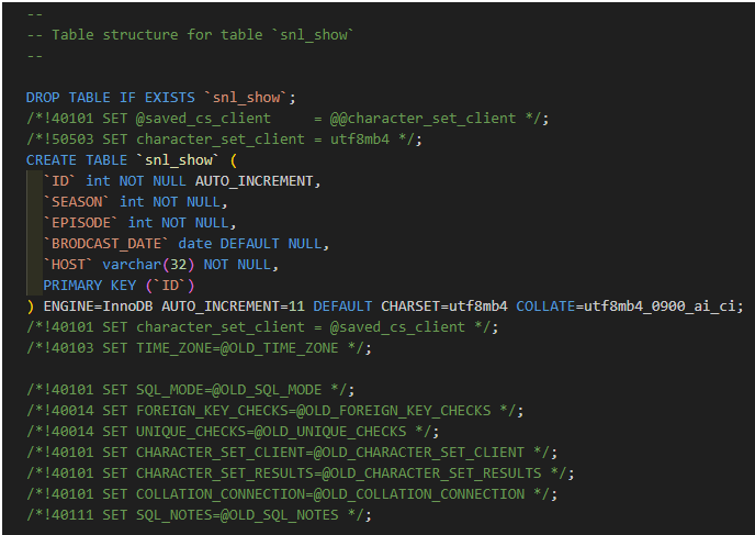 C:\sql_ws> mysqldump -d -u root -p zerobase snl_show -r snl.sql