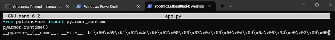 파이선 기반의 솔루션 중 가장 강력한 암호화 패키지인 pyArmor를 이용. 디렉토리와 모델 암호화는 직접 변수를 수정해가며 수행하였음. 아래는 암호화 된 인퍼런스 코드의 일부▼