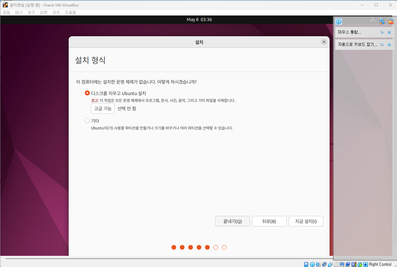 5. 설치 운영체제가 없을 경우 나오는 창인 듯 하다. 처음부터 새로 설치하는 상황이므로 지금 설치 클릭
