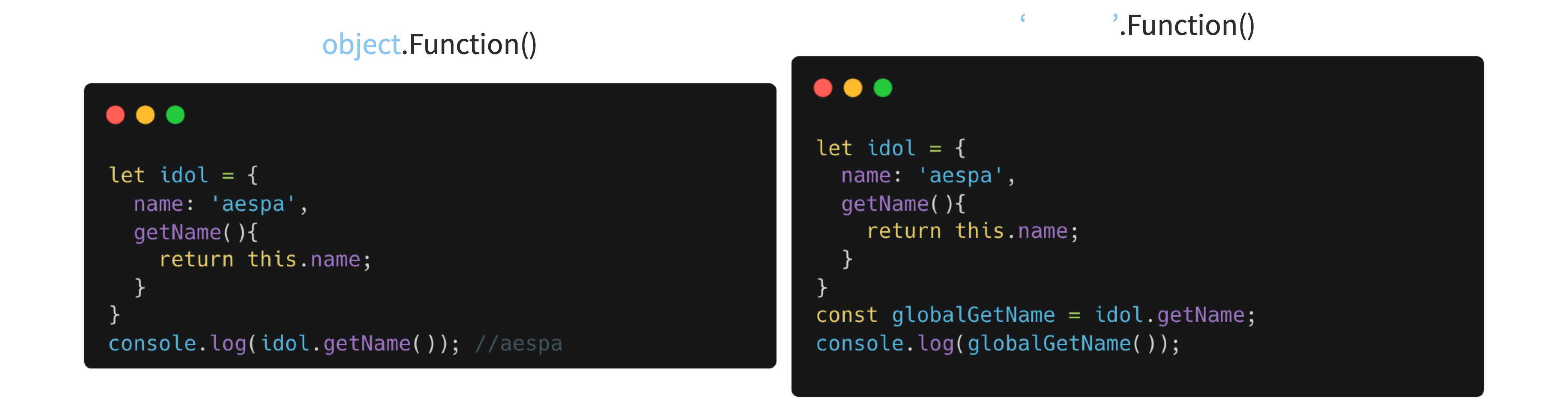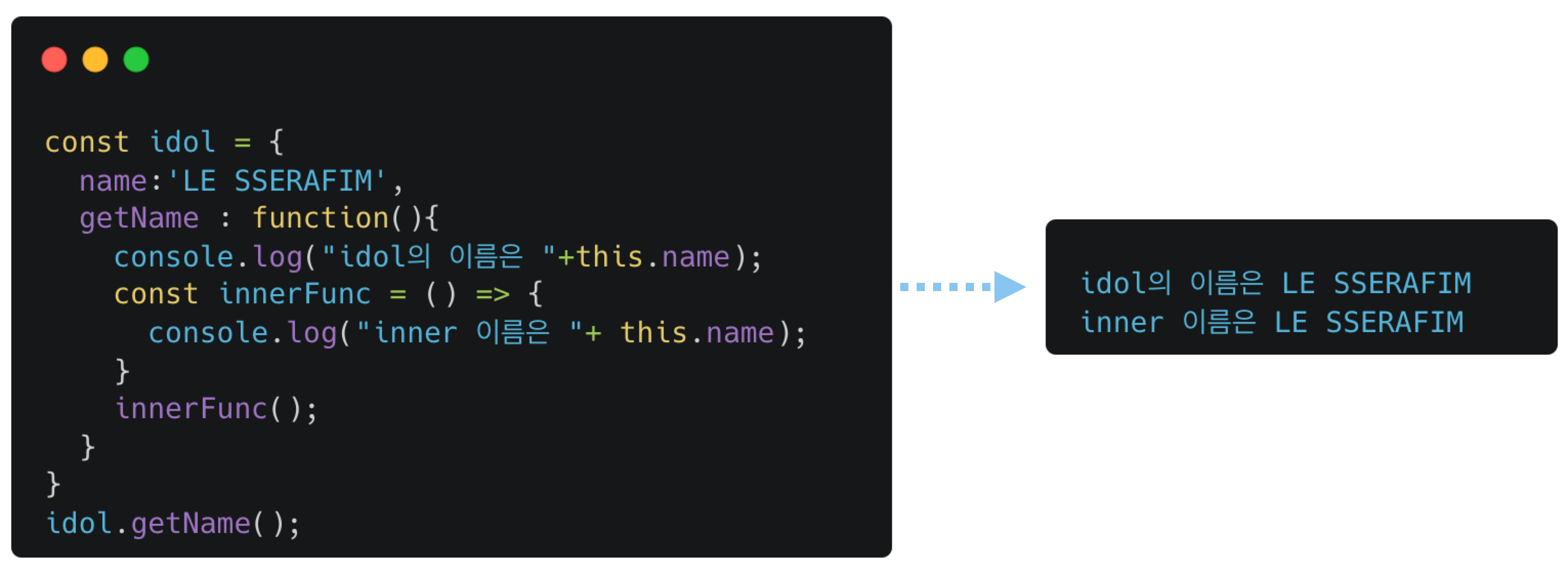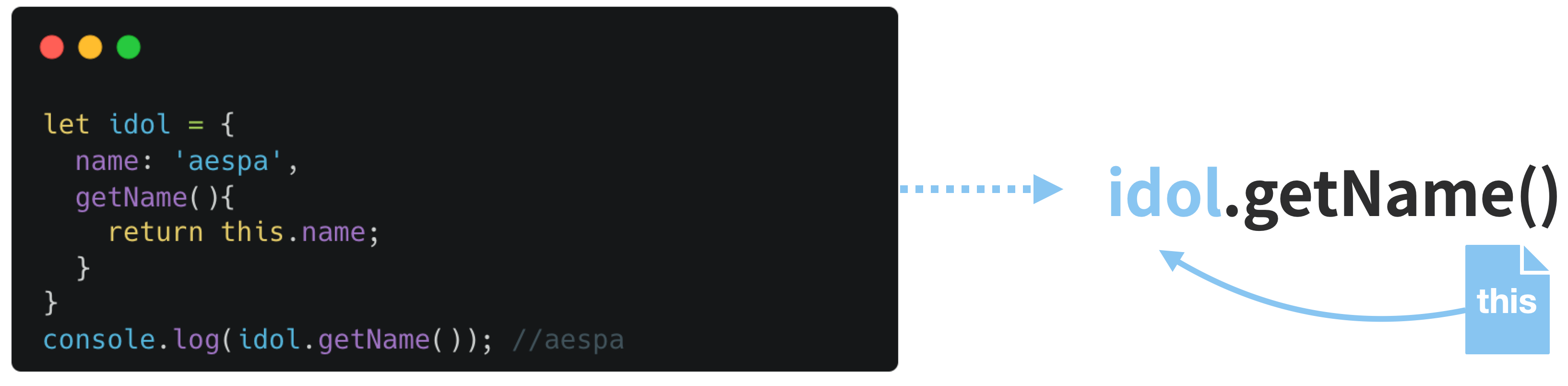 왼쪽 코드에서 getName 함수는 idol이라는 객체에 의해 실행되었습니다.