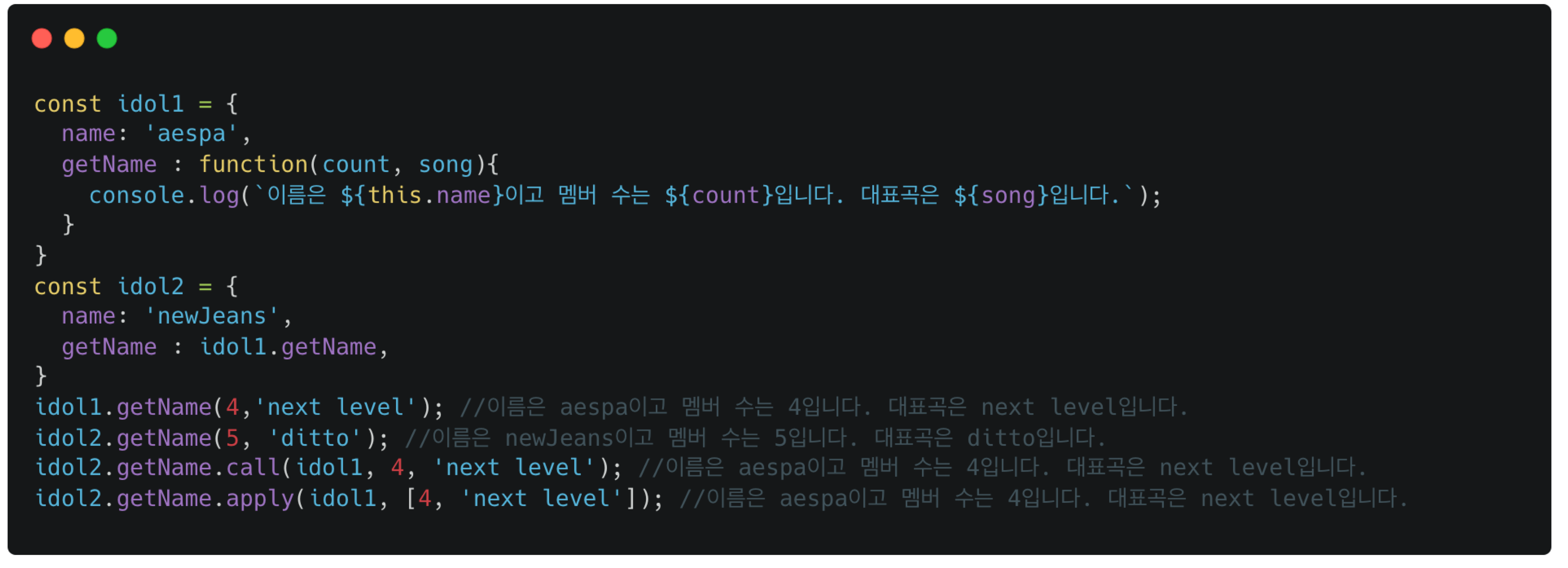 즉, 이 코드에서는 idol2에서 getName을 호출했지만, 명시적 바인딩을 통해 this를 idol1으로 고정시켜주었으므로, idol1의 name을 출력합니다.