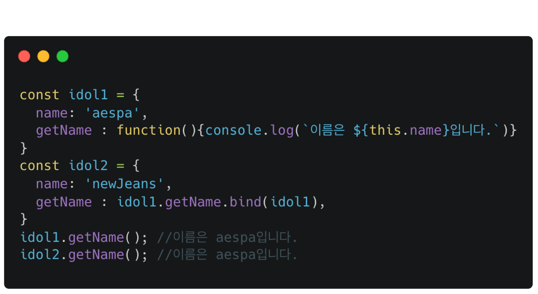 idol2 객체에서 달라진 부분은 getName을 idol1.getName.bind(idol1)으로 가져오고 있다는 점입니다.