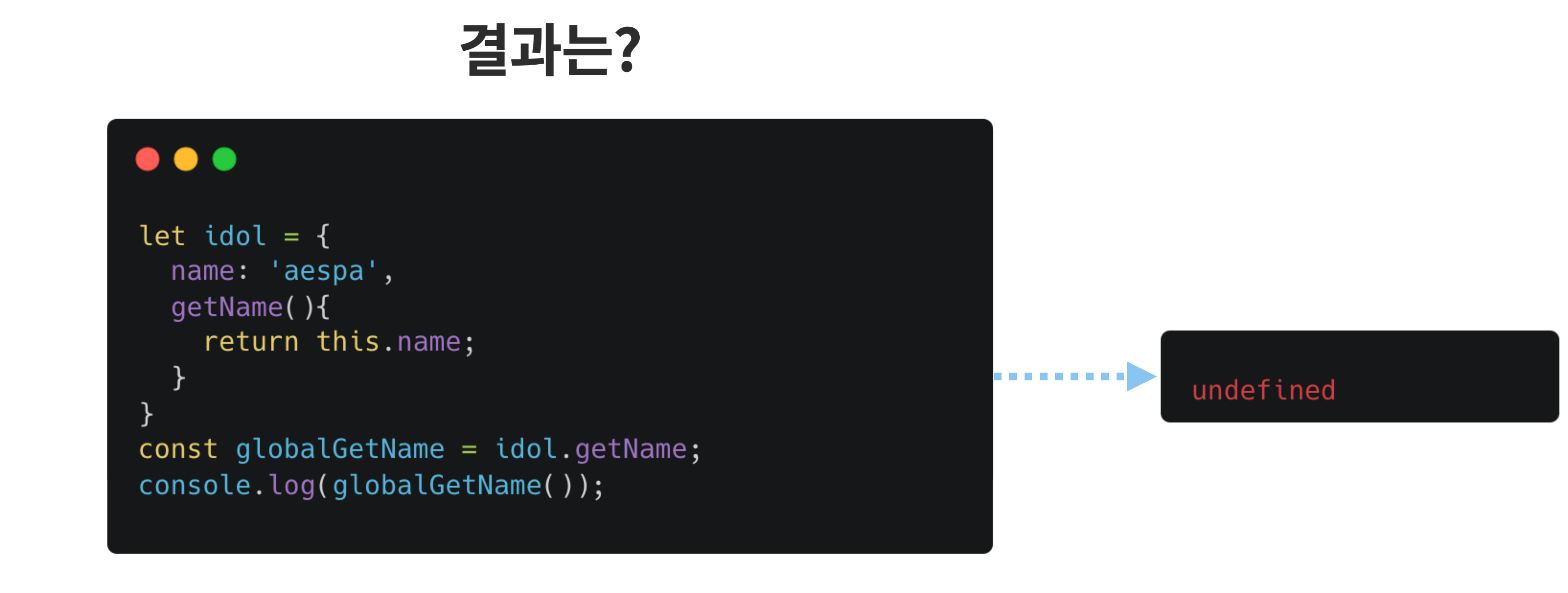따라서 함수가 호출되는 시점에서 this는 idol이 아닌 Window(혹은 전역객체)를 참조하게 되기 때문에, name이라는 프로퍼티에 접근할 수 없어 undefined를 출력한 것입니다.