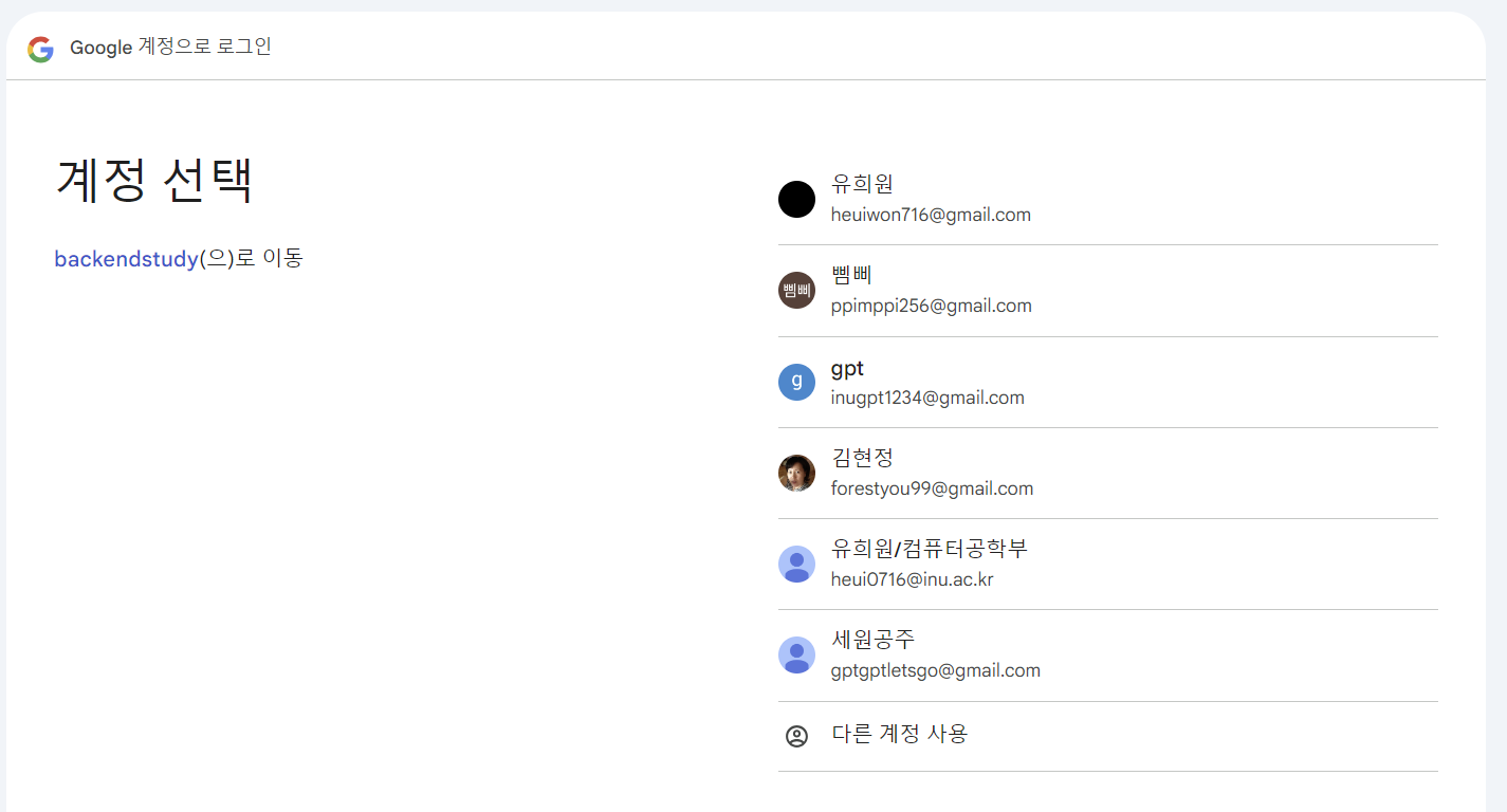로그인 창에서 아래에 구글로 로그인 버튼을 추가하고, 누르면 아래와 같이 구글로 로그인 창이 뜨게 된다.