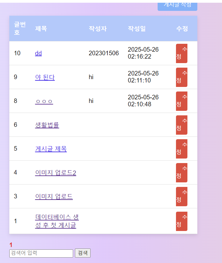 테스트용으로 hi라는 계정과 202301506이라는 계정으로 회원가입 및 로그인 후 게시글 작성도 해보았다. 게시글 작성자와 작성한 시간도 정상적으로 보이는 것을 확인할 수 있다.