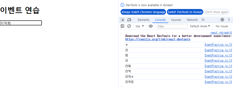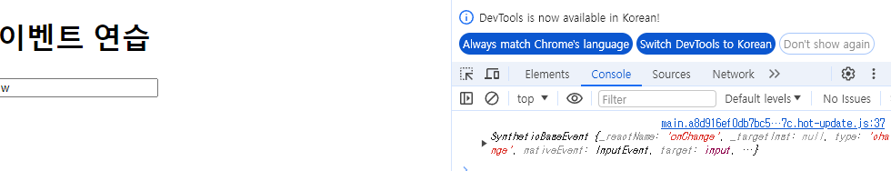input 태그의 값을 입력할때마다 SyntheticEvent가 콘솔에 출력되는 것을 확인할 수 있는데 e객체는 SyntheticEvent로 웹 브라우저의 네이티브 이벤트를 감싸는 객체이다. SyntheticEvent는 이벤트가 끝나고 나면 초기화 된다.