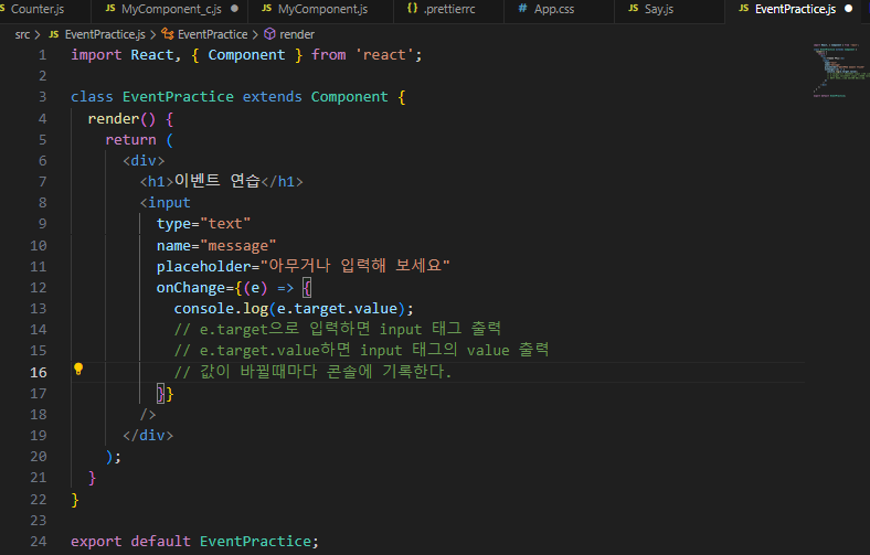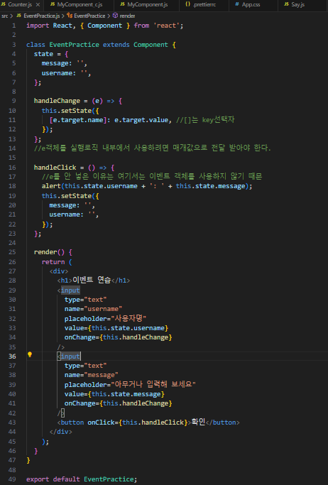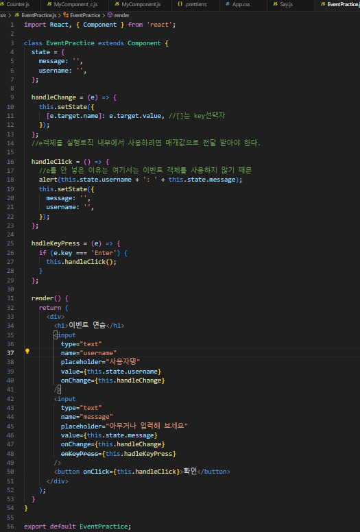 위 코드에서 꼭 확인해야 할 코드는(핵심코드) ->handleChange = (e) => { this.setState({ [e.target.name]: e.target.value, //[]는 key선택자 }); };onKeyPress 이벤트