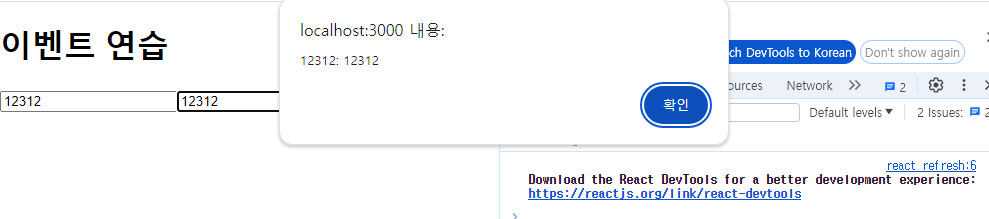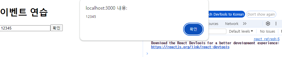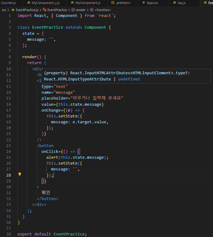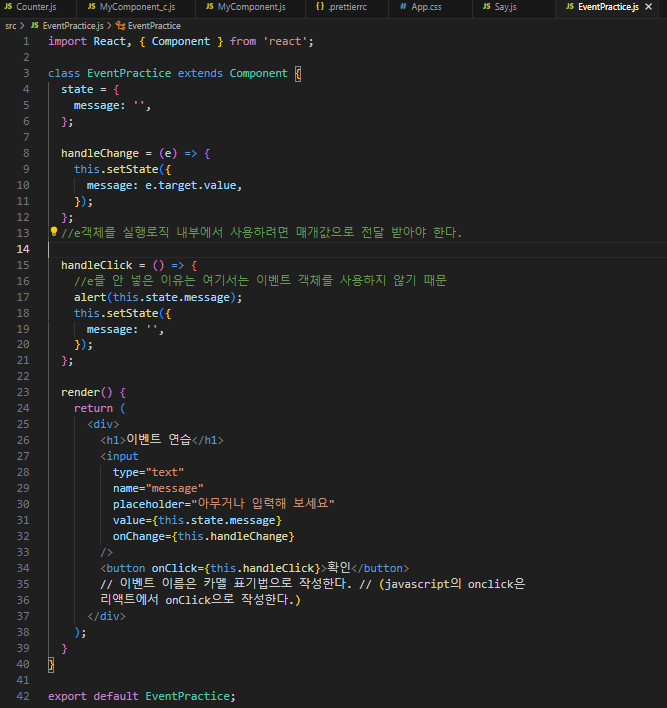 import React, { Component } from 'react'; class EventPractice extends Component { state = { message: '', username: '', }; handleChange = (e) => { this.setState({ [e.target.name]: e.target.value, //[]는 key선택자 }); }; //e객체를 실행로직 내부에서 사용하려면 매개값으로 전달 받아야 한다. handleClick = () => { //e를 안 넣은 이유는 여기서는 이벤트 객체를 사용하지 않기 때문 alert(this.state.username + ': ' + this.state.message); this.setState({ message: '', username: '', }); }; hadleKeyPress = (e) => { if (e.key === 'Enter') { this.handleClick(); } }; render() { return ( <div> <h1>이벤트 연습</h1> <input type="text" name="username" placeholder="사용자명" value={this.state.username} onChange={this.handleChange} /> <input type="text" name="message" placeholder="아무거나 입력해 보세요" value={this.state.message} onChange={this.handleChange} onKeyPress={this.hadleKeyPress} /> <button onClick={this.handleClick}>확인</button> </div> ); } } export default EventPractice;