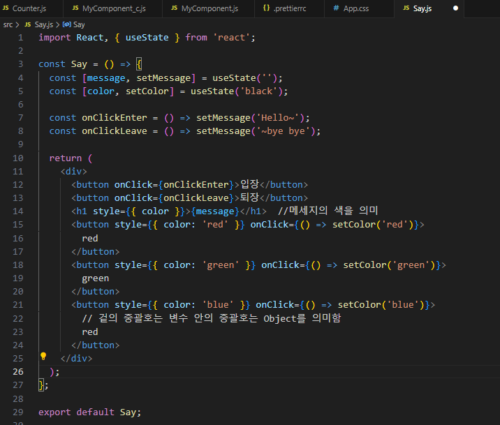 state값을 바꾸어야 할 때는 setState 혹은 useState를 통해 전달받은 set함수를 사용해야 한다.
