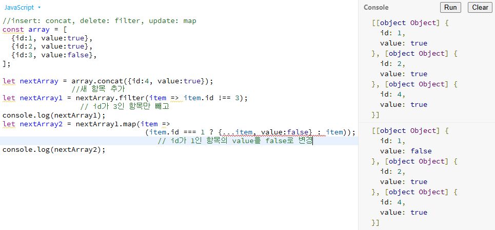 보통 실무에서 삭제할 때 사용- Array.prototype.map() -> 배열 내의 모든 요소 각각에 대하여 주어진 함수를 호출한 결과를 모아 새로운 배열을 반환