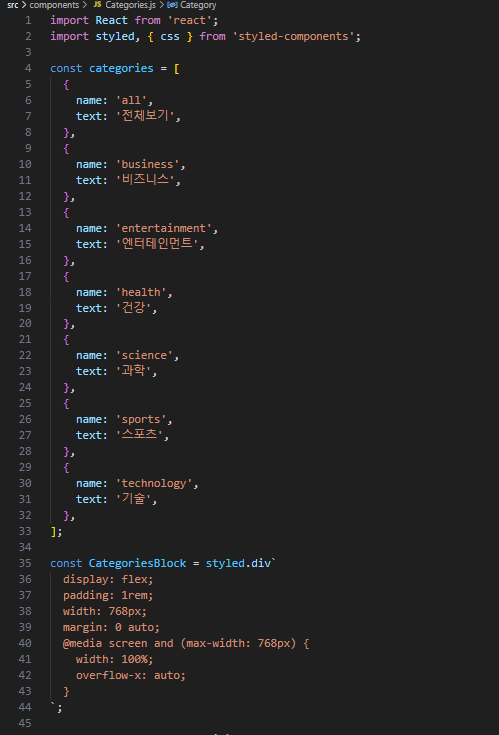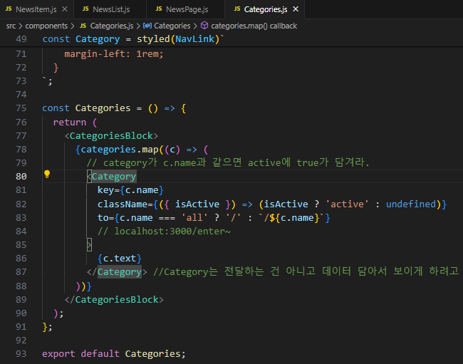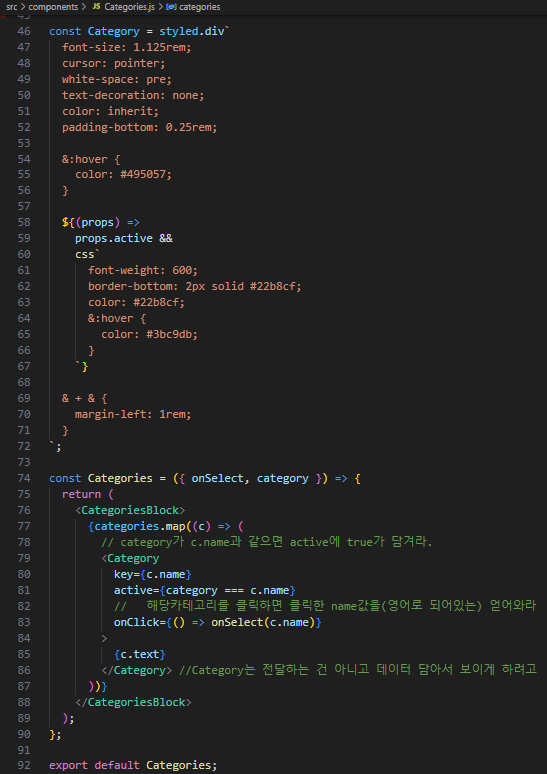 그리고 나서category와 onSelect 함수를 Catagories 컴포넌트에게 props로 전달해준다(Categories의 c.name값을 받아오게 된다)