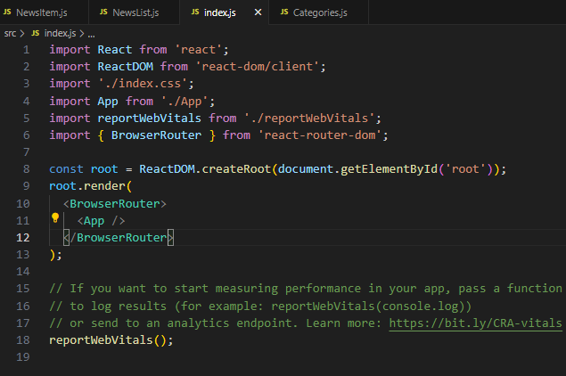 const root = ReactDOM.createRoot(document.getElementById('root')); root.render( <BrowserRouter> <App /> </BrowserRouter> );