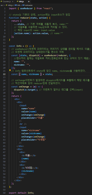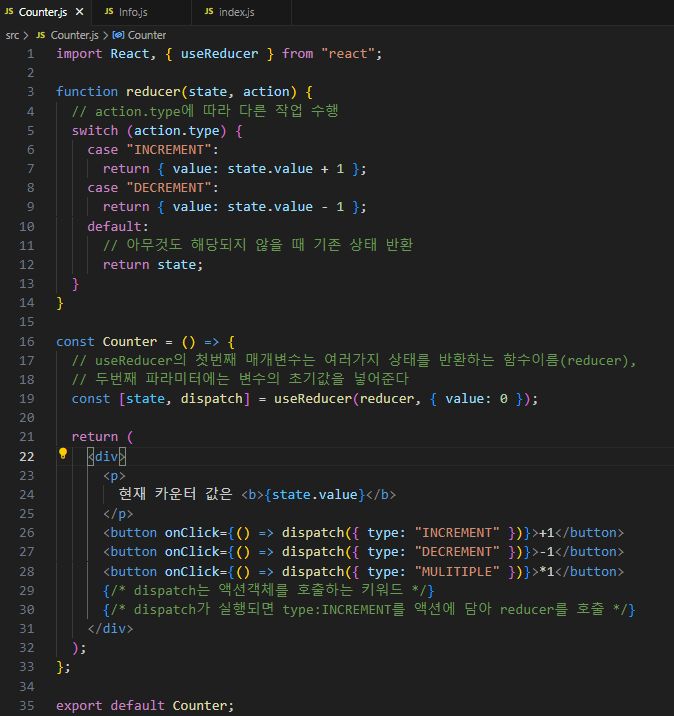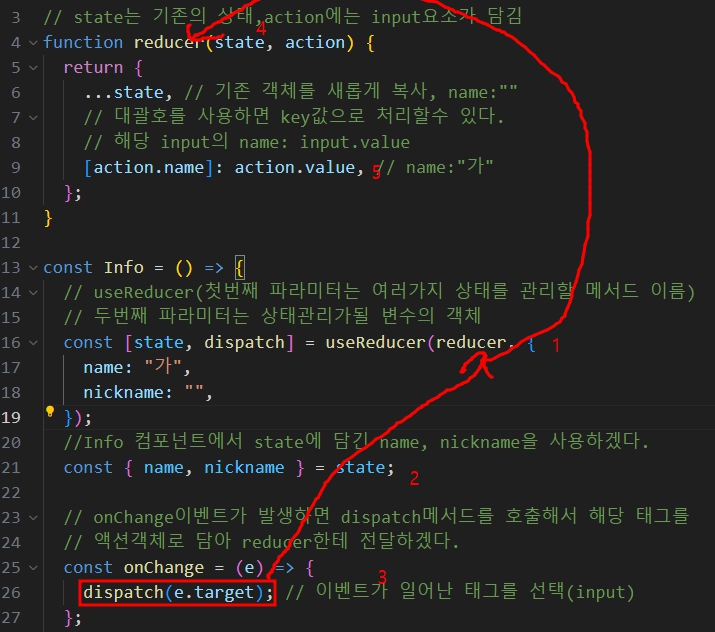 reducer 현재상태(초기값), 그리고 데이터 수정방법을 위해 필요한 정보를 담은 액션(action)값을 전달받아 새로운 상태를 반환하는 함수이다. reducer 함수에서 새로운 상태를 만들때는 반드시 불변성을 지켜줘야 한다.function reducer(state, action){ return{...}// 불변성을 지키면서 업데이트한 새로운 상태를 반환한다. } { type:’INCREMENT’, // 다른 값들이 필요하다면 추가로 들어감 }