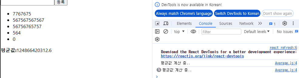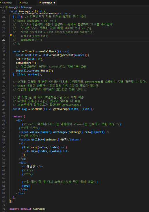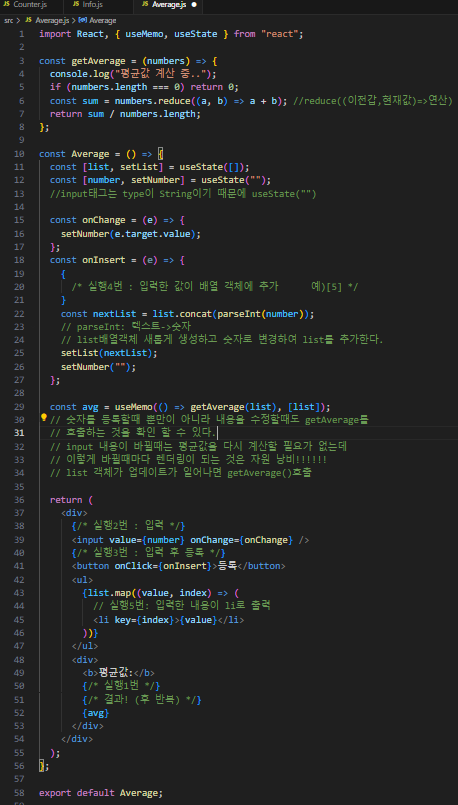 import React, { useCallback, useMemo, useRef, useState } from "react"; const getAverage = (numbers) => { console.log("평균값 계산 중.."); if (numbers.length === 0) return 0; const sum = numbers.reduce((a, b) => a + b); return sum / numbers.length; };