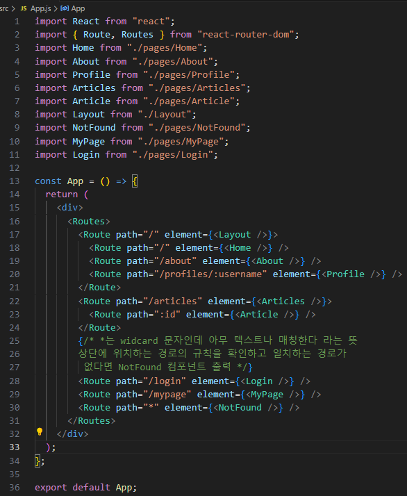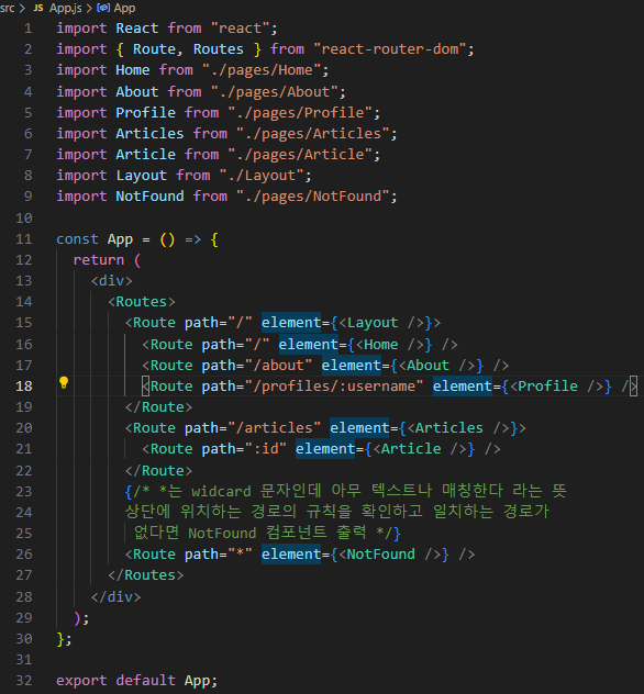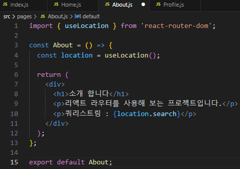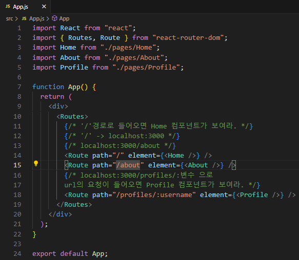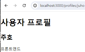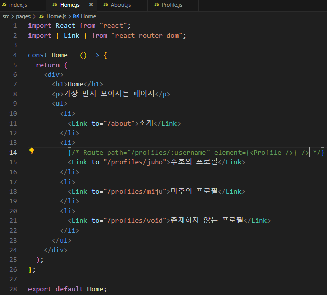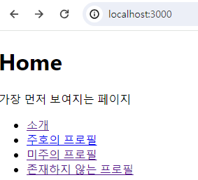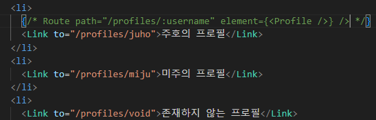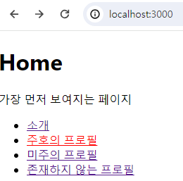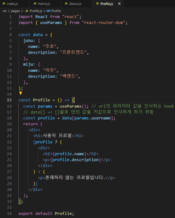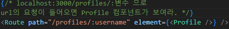 그 후 App의 :username은 Home.js의 profiles/name>으로 넘어가서 Profile.js에서 값을 받는다.