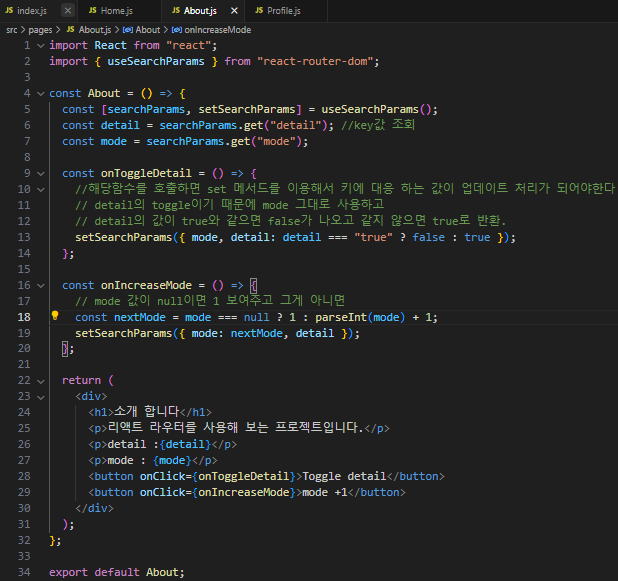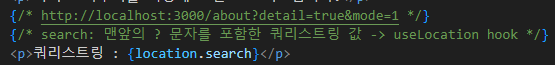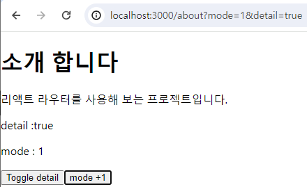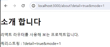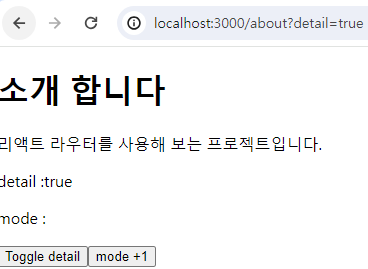 - 쿼리스트링 값이 현재 ?detail=true&mode=1 로 표시.