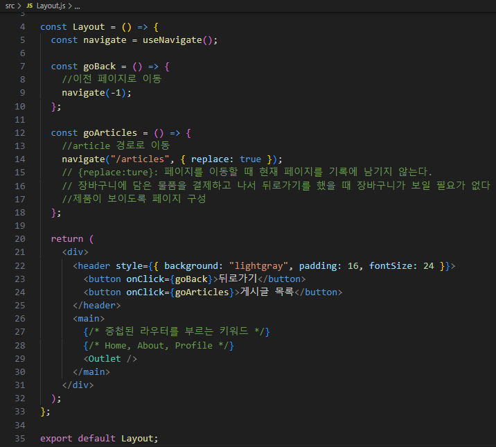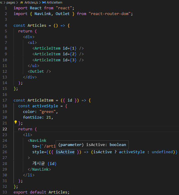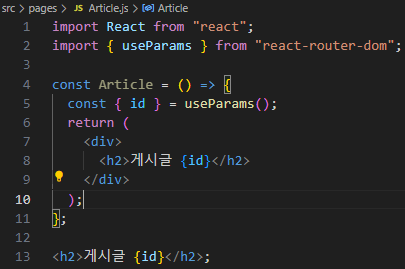 1. <Route path="/articles" element={<Articles />}> 의 <ArticleItem id={1} /> 를 클릭하면 2. <NavLink to={`${id}`} style={({ isActive }) => (isActive ? activeStyle : undefined)} 게시글 {id} </NavLink> {/* articles/:id */} <Route path=":id" element={<Article />} /> 3. import { useParams } from "react-router-dom"; const Article = () => { const { id } = useParams(); return ( <div> <h2>게시글 {id}</h2> </div> ); }; export default Article;