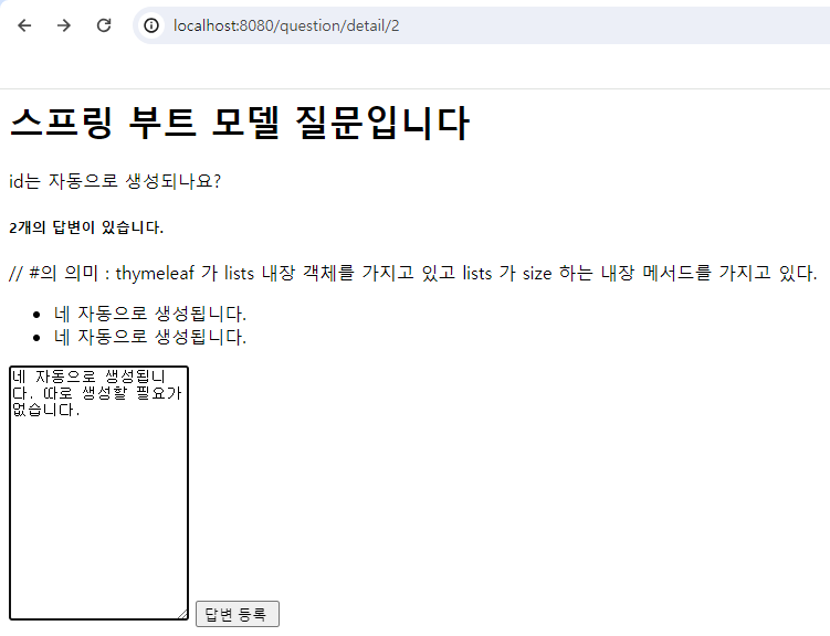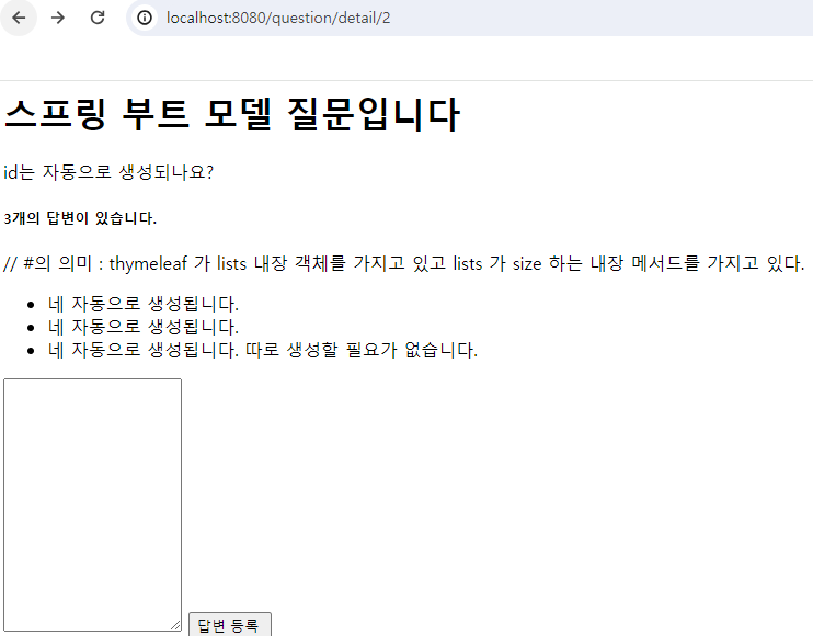<h1 th:text="${question.subject}"></h1> <div th:text="${question.content}"></div> <h5 th:text="|${#lists.size(question.answerList)}개의 답변이 있습니다.|"></h5> // th : thymeleaf //# : thymeleaf의 내장함수 // #의 의미 : thymeleaf 가 lists 내장 객체를 가지고 있고 lists 가 size 하는 내장 메서드를 가지고 있다. <div> <ul> <li th:each="answer : ${question.answerList}" th:text="${answer.content}"></li> </ul> </div> <form th:action="@{|/answer/create/${question.id}|}" method="post"> <textarea name="content" id="content" rows="15"></textarea> <input type="submit" value="답변 등록 "> </form> ``` - 실행 및 결과