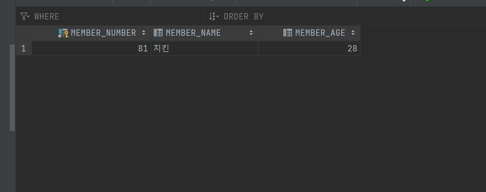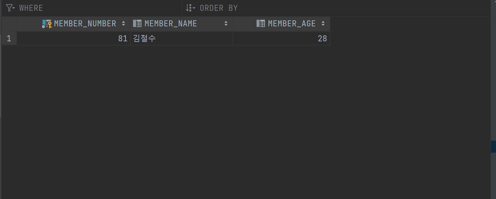 INSERT를통해 MEMBER_NUMBER, MEMBER_NAME, MEMBER_AGE값을 넣고