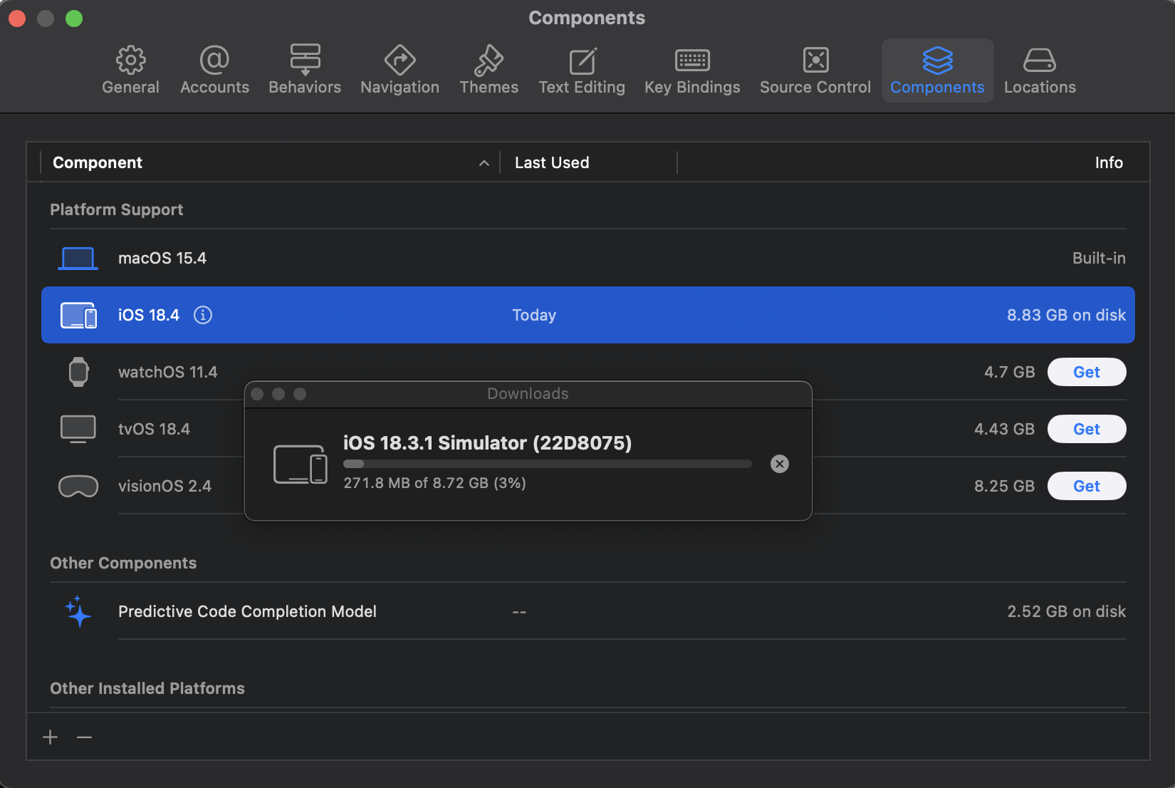 Xcode의 componens매뉴에서 좌측 하단 + 버튼을 통해 원하는 버젼의 IOS Simulator를 추가해줬다. (집 와이파이로 설치하는데 5분 정도 걸린듯)
