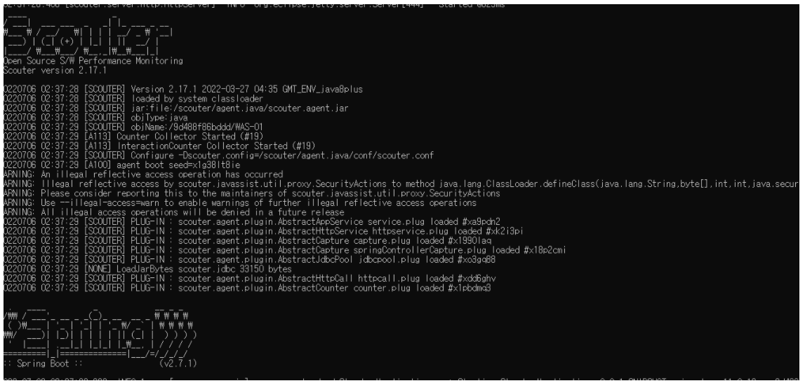 #스카우터 서버 경로로 가서 스카우터 서버를 실행 그리고 스카우터 agent와 conf정보를 물려서 스프링 jar 실행