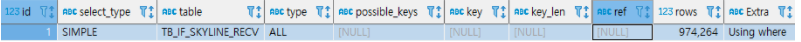 10. ALL : 이전 테이블과의 조인을 위해 풀스캔이 된다. 만약 조인에 쓰인 첫 테이블이 고정이 아니라면 비효율적이다. 그리고 대부분의 경우 아주 느리며, 보통 상수값이나 상수인 컬럼값으로 row를 추출하도록 인덱스를 추가하여 ALL 타입을 피할 수 있다.