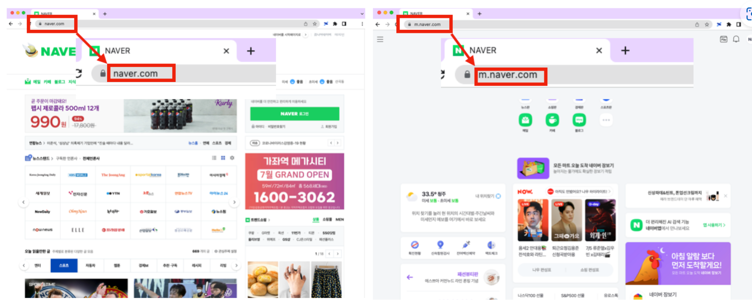 그러나 위의 예시처럼 특정 장치에 최적화된 페이지로 연결되는 별도의 URL이 있다면 반응형 웹이라고 부르지 않습니다. 특정 장치에 연결이 되는 별도의 URL은 모바일의 경우 대개 m.domainname.com 같은 식으로, 도메인 앞에 모바일을 의미하는 “m”을 붙임으로써 구분합니다. 특정 장치에 연결이 되는 별도의 URL과 화면이 구비된 웹 사이트의 경우, 데스크탑 버전의 웹 사이트를 띄운 브라우저를 줄였을 때 반응하지 않는다는 특징이 있습니다.
