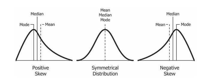 Positive Skewness는 오른쪽 꼬리가 왼쪽보다 더 길 때를 의미하고 평균(Mean)과 중위수(Median)가 최빈값(Mode)보다 크는 것을 의미합니다.